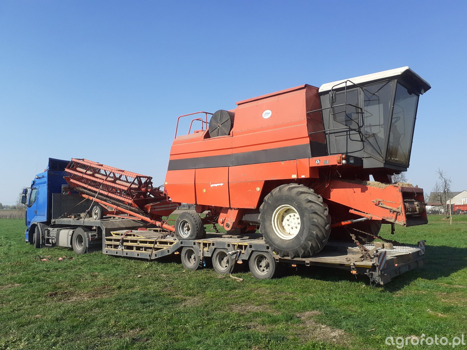 Kombajn Bizon BS Z110 przygotowywany do transportu na polu. Maszyna ta, charakterystyczna dla polskiego przemysłu rolniczego, wyposażona jest w silnik o mocy około 240 KM, co umożliwia efektywne zasilanie bębnowego systemu omłotu. Duży zbiornik, mieszczący około 4 500 litrów zboża, zapewnia długotrwałą pracę bez potrzeby częstego opróżniania. Zamontowany heder z motowidłami o szerokości roboczej wynoszącej około 5,2 metra jest szczególnie przydatny podczas żniw, przyspieszając proces zbioru. Kombajn ten widoczny jest na lawecie, co sugeruje transport na inne pole lub do siedziby gospodarstwa.
