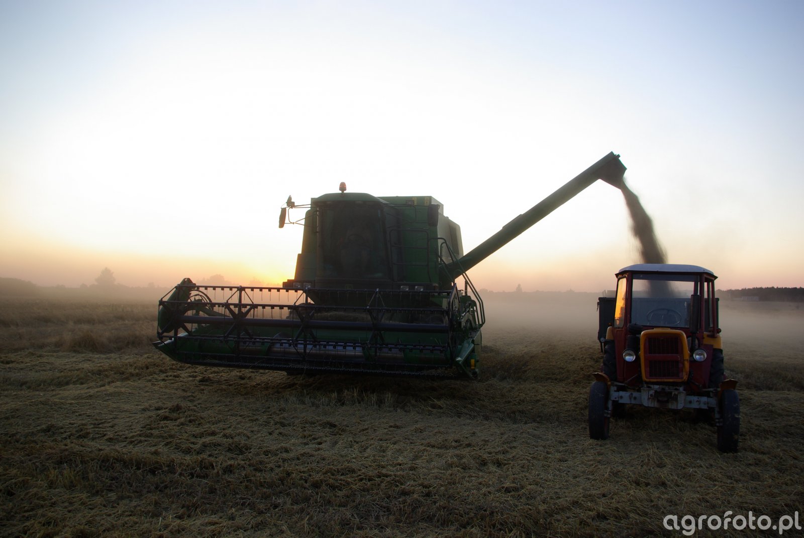 Kombajn John Deere 1450 CWS podczas działań żniwnych na polu zboża. Prezentowana maszyna wyposażona jest w heder z motowidłami, co sugeruje, że bierze udział w koszeniu zbóż. Silnik o mocy 185 KM oraz system omłotu tangencial-critical zapewniają efektywną separację ziarna. Zbiornik o pojemności 6500 litrów pozwala na długą pracę między rozładunkami. Na zdjęciu widoczne jest rozładowywanie zboża do przyczepy ciągniętej przez traktor Ursus C-330M, co jest typowym etapem prac polowych podczas żniw. Całość odbywa się na tle zachodzącego słońca, co dodaje krajobrazowi atmosferycznego wymiaru.