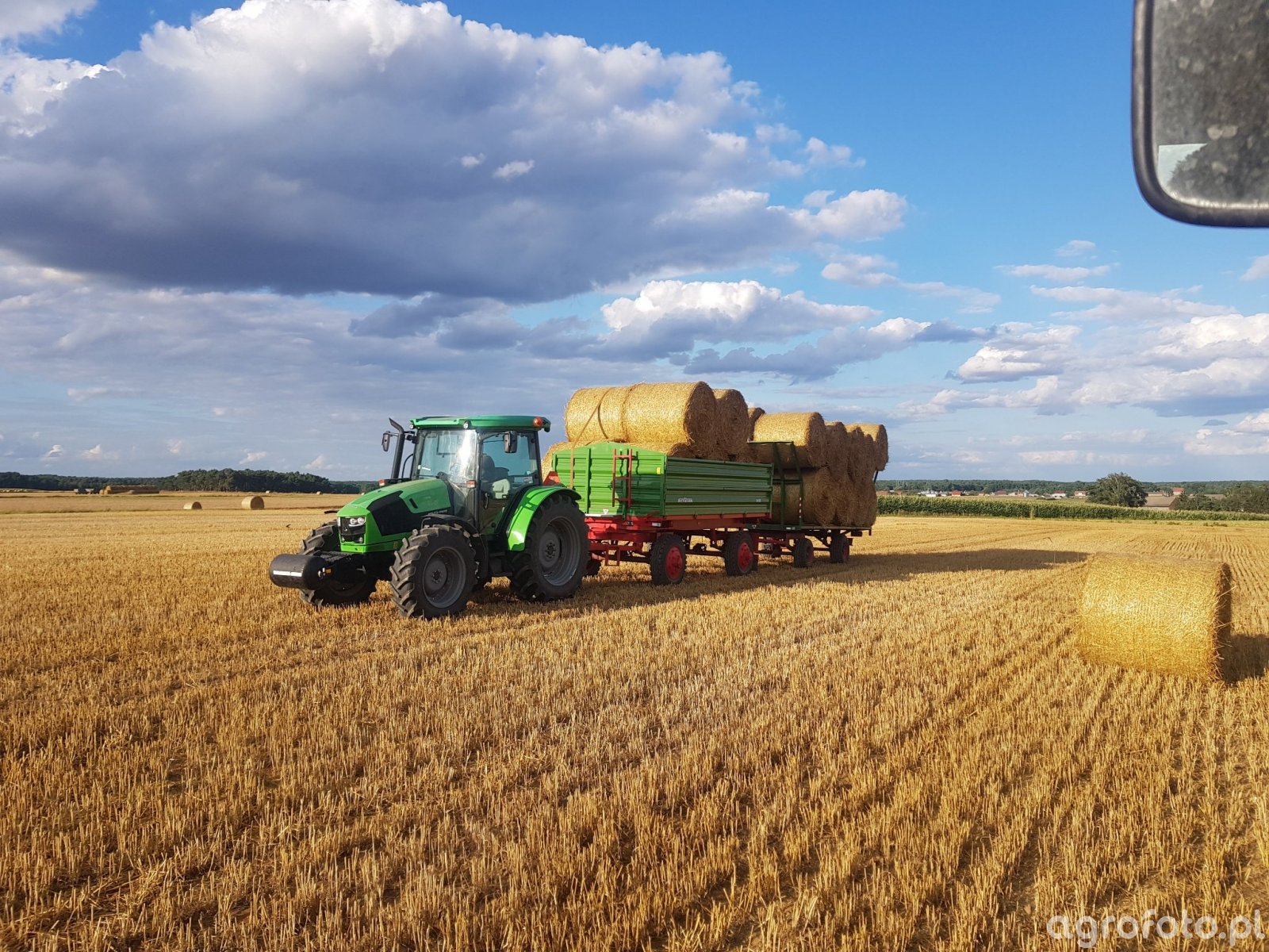 Ciągnik Deutz-Fahr 5110C w pełnej akcji podczas transportu bel na polu. Maszyna napędzana jest silnikiem o mocy 109 KM, produkowanym przez firmę Deutz. Silnik to czterocylindrowa jednostka o pojemności skokowej 3,6 litra, co gwarantuje optymalną wydajność w pracach polowych. Typ skrzyni biegów, mechaniczna 20/20, umożliwia precyzyjne dostosowywanie prędkości do zmiennych warunków pracy. Ciągnik współpracuje z przyczepą rolniczą, co pozwala na efektywny transport dużej ilości bel siana, maksymalizując wydajność codziennych zadań. Solidna konstrukcja i unikalne cechy techniczne modelu 5110C czynią go odpowiednim wyborem dla wymagających operacji na polu.
