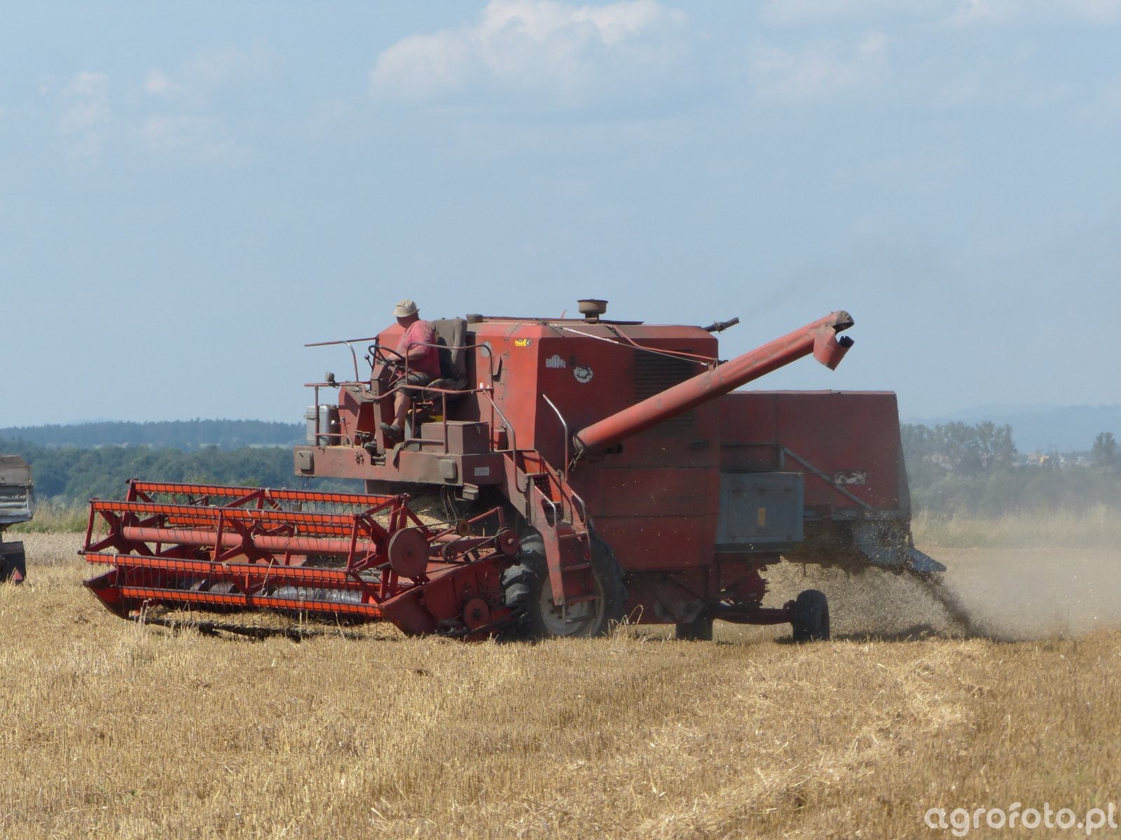 Kombajn Bizon Z056 podczas żniw na polu zboża. Charakterystyczny czerwony kolor oraz konstrukcja hedera z motowidłami wskazują na model Z056, popularny wśród rolników ze względu na efektywność w pracy. Maszyna wyposażona jest w silnik o mocy 100 KM, co pozwala na efektywne zasilanie systemu młocarni bębnowo-sitowej, zapewniającej wysoką jakość omłotu. Zbiornik ziarna o pojemności 3 000 litrów umożliwia długą pracę w polu bez konieczności częstych przerw na rozładunek. Kombajn porusza się po ściernisku, kończąc koszenie dojrzałych zbóż w realistycznych warunkach polowych.