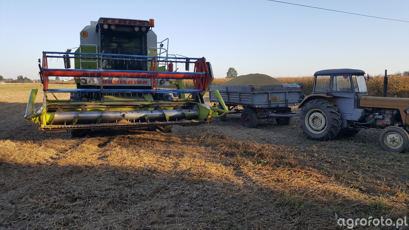 Kombajn Claas Dominator podczas prac żniwnych na polu. Widoczna maszyna jest wyposażona w heder z motowidłami, co oznacza, że zajmuje się koszeniem zbóż. Model Dominator to dobrze znany sprzęt wśród rolników, znany z efektywnego działania oraz solidnej konstrukcji. W typowym modelu, jak Claas Dominator 204, możemy spodziewać się sześciocylindrowego silnika Mercedes o mocy około 200 KM, co zapewnia odpowiednią wydajność podczas żniw. Zbiornik na ziarno ma pojemność około 6500 litrów, co pozwala na długie okresy pracy bez konieczności częstego rozładunku. Maszyna pracuje na polu, na którym widoczna jest słoma po skoszonym zbożu, a w tle znajduje się przyczepa ziarna, co świadczy o intensywnych pracach żniwnych.