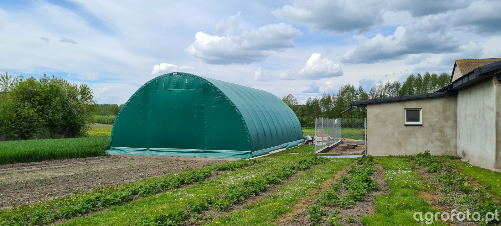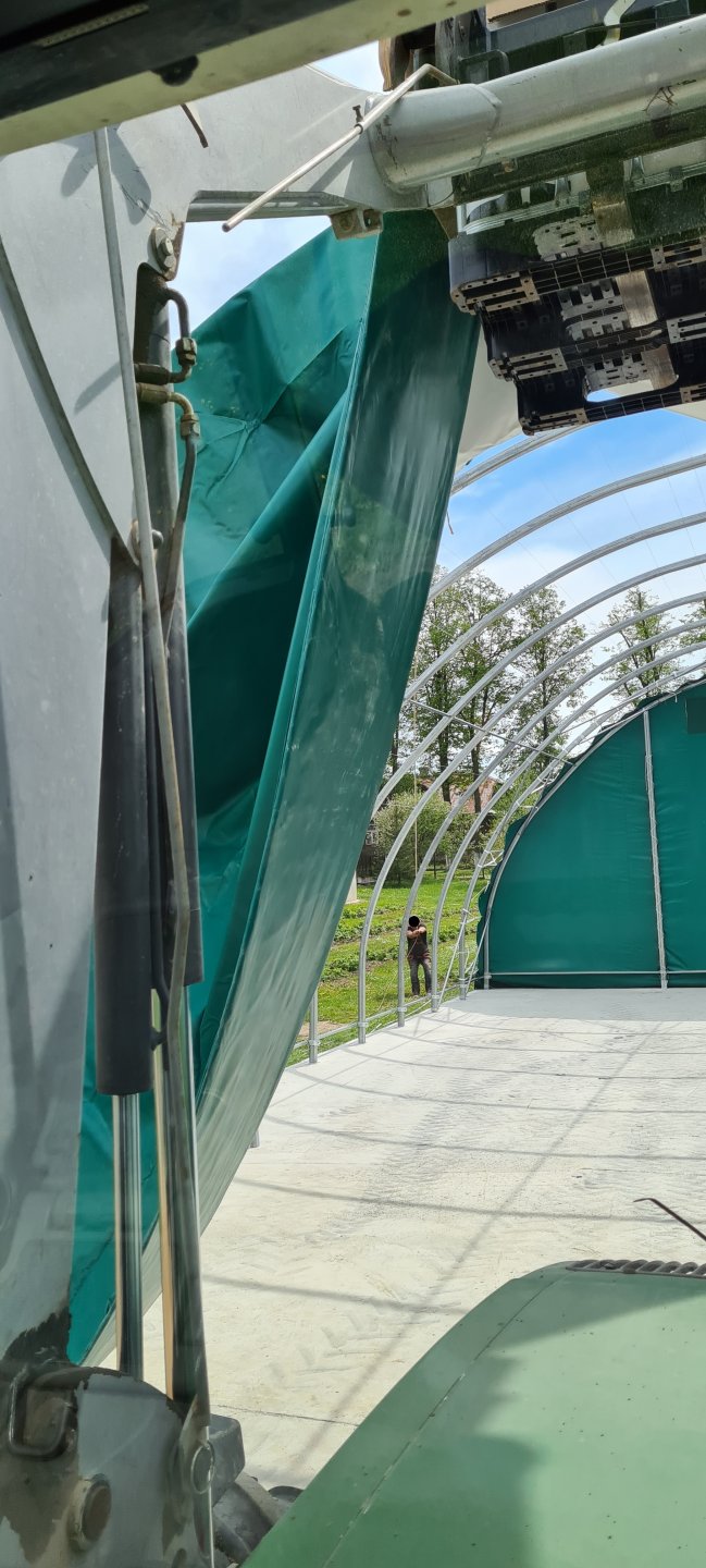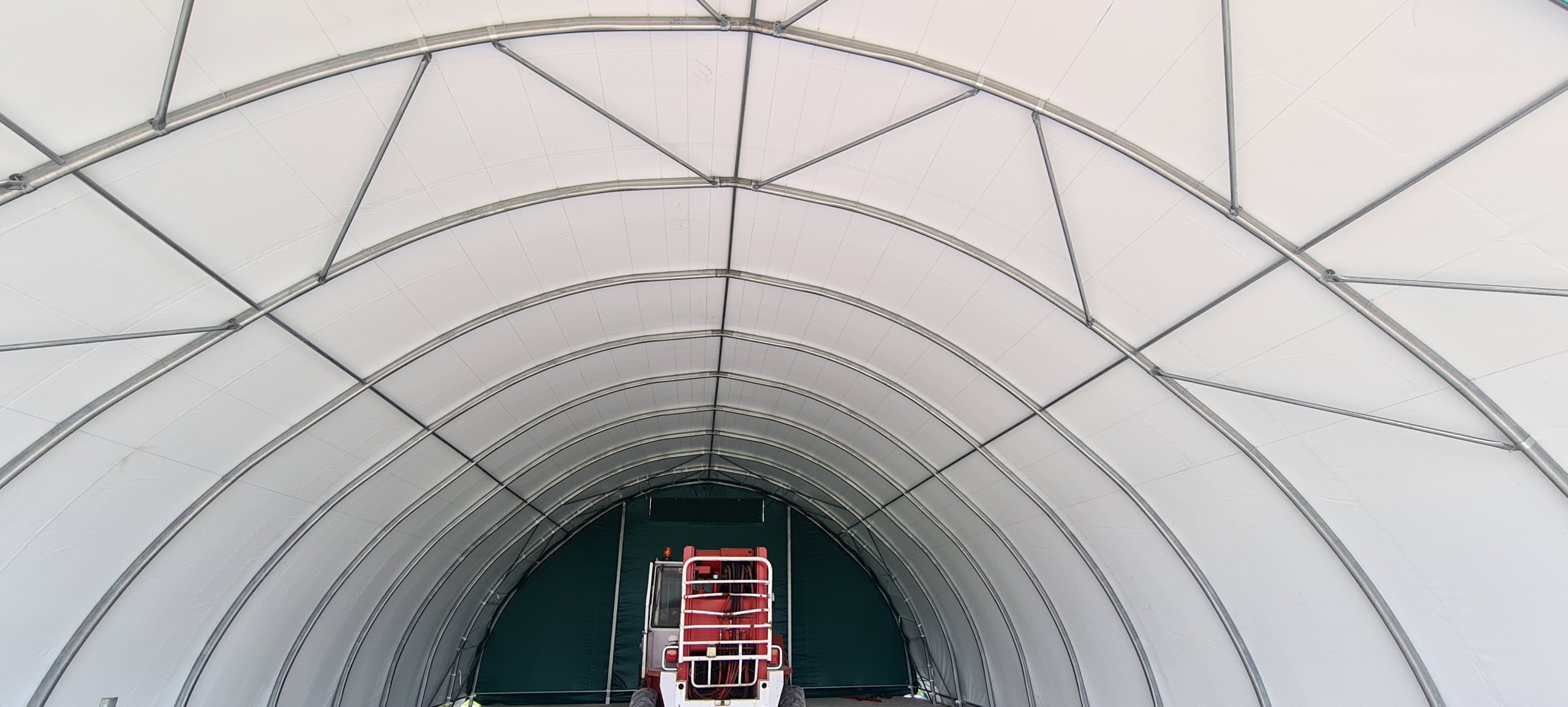 Hala o wymiarach 10x15m wysokość 5m, jeden szczyt zabudowany plandeką, drugi bramą