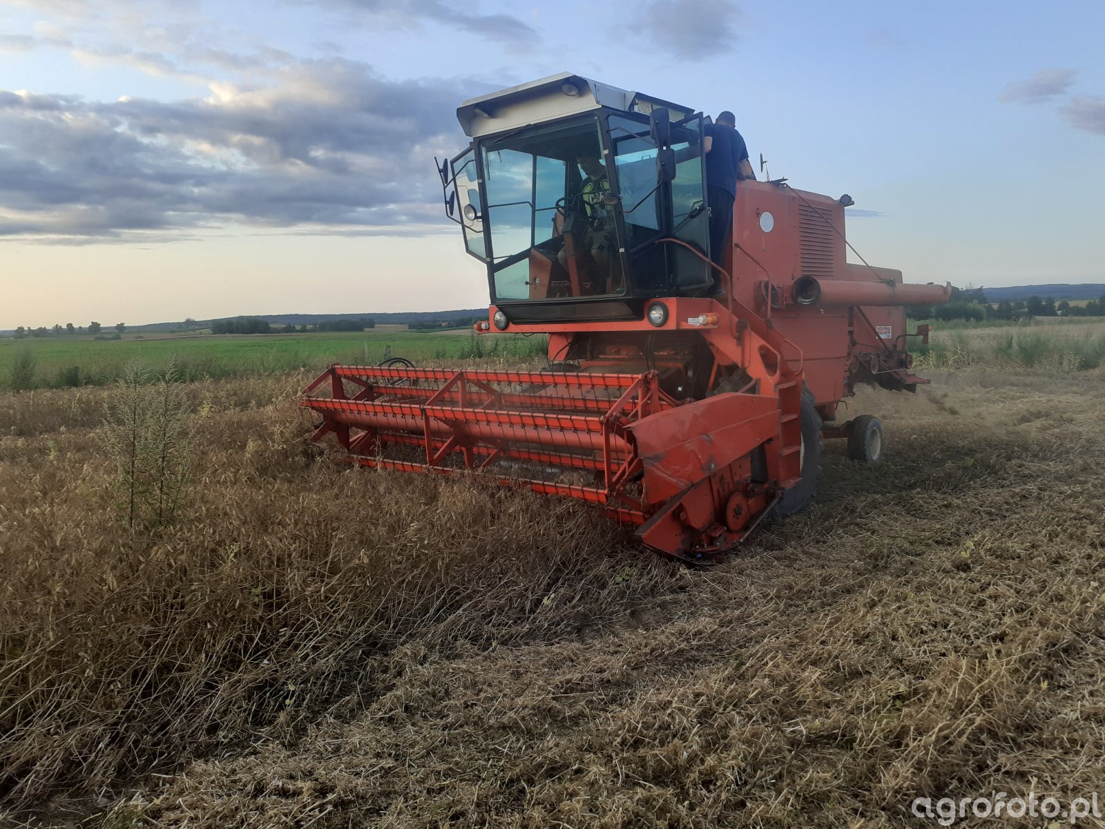 Kombajn zbożowy Bizon podczas koszenia na polu zboża. Maszyna widoczna na zdjęciu pracuje w polu, na tle rozległych pól uprawnych, co sugeruje wysoką efektywność operacyjną. Charakterystyczny czerwony kolor oraz kształt kabiny jednoznacznie identyfikują maszynę jako produkt polskiej marki Bizon. Heder wyposażony w motowidła wskazuje na koszenie zbóż. Silnik diesla o mocy około 170 KM zapewnia napęd dla całego układu omłotowego, którego system bębnowy jest typowy dla tej serii maszyn. Pojemność zbiornika na ziarno to około 3000 litrów, co pozwala na dłuższą pracę bez przerw na opróżnianie. Kombajny te znane są z solidności i niezawodności, co czyni je popularnym wyborem wśród rolników. Maszyna, operująca w relatywnie płaskich warunkach terenowych, jest optymalnym wyborem dla średnich i dużych gospodarstw rolnych.