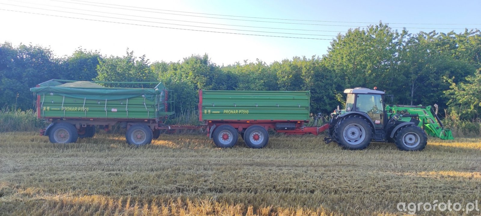 Ciągnik Deutz-Fahr Agrofarm 430G, napędzany silnikiem SDF o mocy 99 KM, efektywnie pracuje na ściernisku, transportując zboże z pomocą przyczepy rolniczej Pronar PT510. Silnik o pojemności 4 litrów i 4 cylindrach zapewnia odpowiednią moc do obsługi ładowacza czołowego, co zwiększa jego wszechstronność w gospodarstwie. Wyposażony w mechaniczną skrzynię biegów 15/15, Agrofarm 430G pozwala na precyzyjne dopasowanie prędkości w zależności od warunków pracy, co jest kluczowe podczas transportu ciężkich ładunków na polu.
