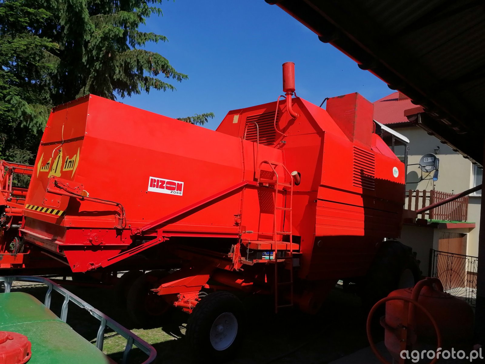 Kombajn Bizon Rekord Z058 przygotowany do pracy w polu. Model ten charakteryzuje się silnikiem o mocy 150 KM, co pozwala na efektywne wykonywanie żniw w średnich gospodarstwach rolnych. Wyposażony jest w bębnowy system omłotu oraz zbiornik o pojemności 3 000 litrów, co umożliwia długotrwałe zbieranie ziarna bez częstego opróżniania. Na zdjęciu maszyna znajduje się na terenie gospodarstwa, gotowa do przewiezienia na pole uprawne. Charakterystyczna czerwona konstrukcja oraz logo Bizona podkreślają niezawodność i trwałość polskiej marki.