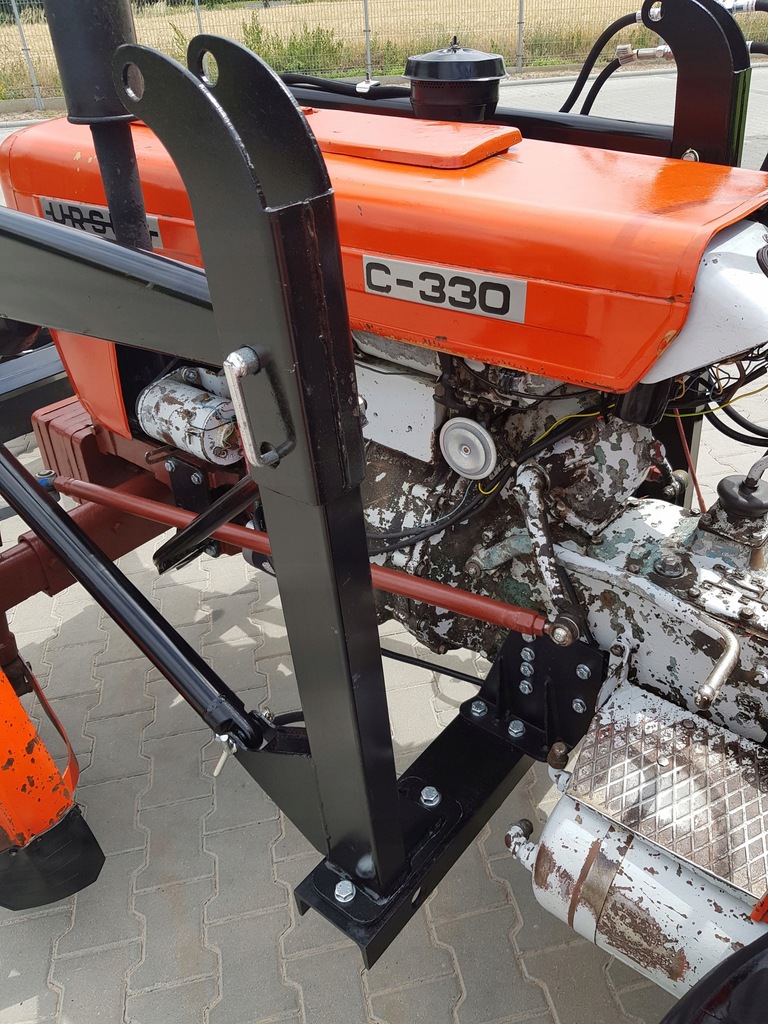 Ursus C-330 z ładowaczem czołowym TUR wykonuje typowe prace przeładunkowe na placu gospodarstwa, wykorzystując niewielką masę własną około 1,7 t oraz sprawdzony silnik S-312C produkcji Andoria o mocy 30 KM. Dwucylindrowa jednostka o pojemności 1960 cm³, chłodzona cieczą, współpracuje z mechaniczną skrzynią biegów 6/2, co zapewnia odpowiedni dobór przełożeń przy manewrowaniu z ładunkiem. Tylni podnośnik TUZ o udźwigu około 1200 kg pozwala na współpracę z lekkimi maszynami uprawowymi i transportowymi, a zamontowany ładowacz czołowy zwiększa funkcjonalność ciągnika przy załadunku obornika, materiałów sypkich czy palet. Model C-330 był produkowany w latach 1967–1987 i nadal jest popularny w małych i średnich gospodarstwach, gdzie ceniona jest jego prosta konstrukcja, tania eksploatacja i dobra dostępność części. Przybliżone ceny rynkowe zadbanych używanych egzemplarzy w Polsce mieszczą się najczęściej w przedziale 15–30 tys. zł, zależnie od stanu technicznego, wyposażenia i roku produkcji.