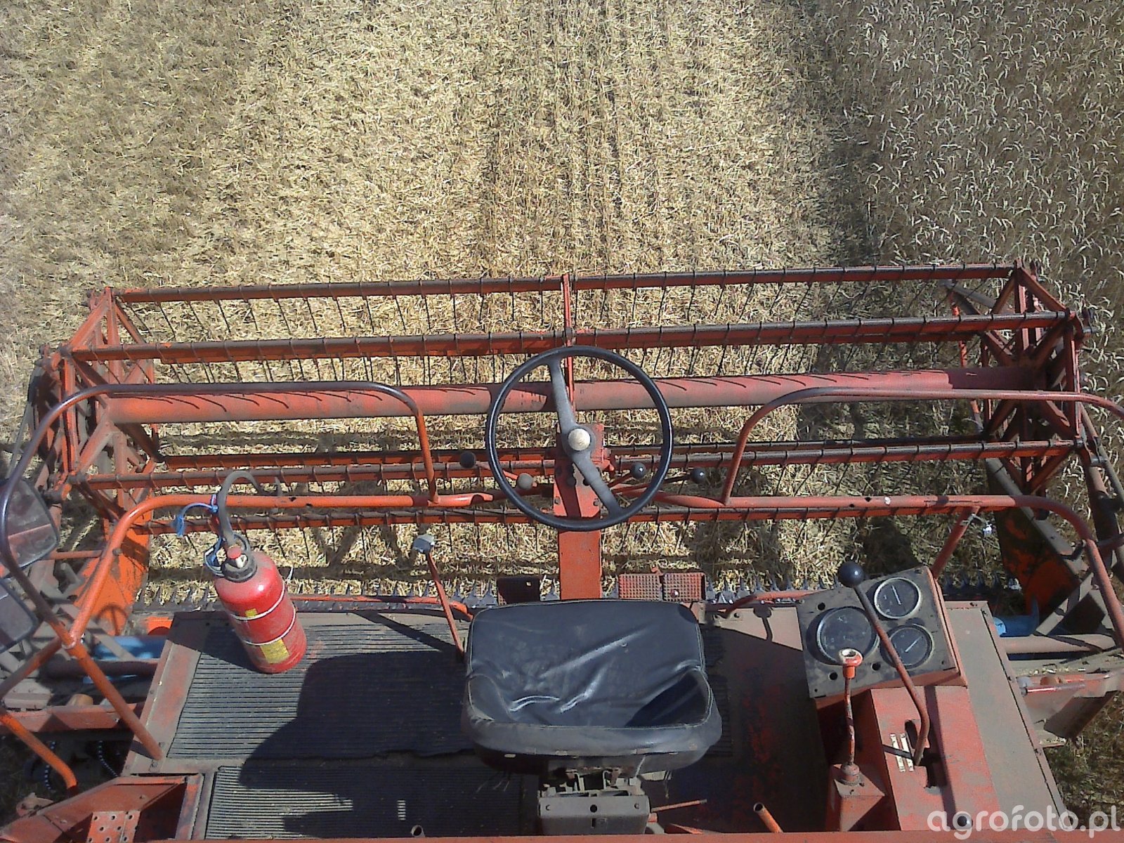 Kombajn Bizon Z056 podczas koszenia zbóż na polu. Widoczny na zdjęciu heder z motowidłami umożliwia efektywne zbieranie dojrzałych ziaren. Bizon Z056 jest wyposażony w sześciocylindrowy silnik SW 400 o mocy 100 KM, który napędza mechaniczny system omłotu z bębnem młócącym. Maszyna ta posiada zbiornik na ziarno o pojemności 2540 litrów, co pozwala na dłuższą pracę bez konieczności częstego opróżniania. Konstrukcja kombajnu, charakterystyczna dla polskiej produkcji, wyróżnia się solidnym wykonaniem, dostosowanym do pracy na różnych rodzajach gleb. Podczas pracy na polu widoczna jest dokładność koszenia i efektywność hedera w zbieraniu plonów.