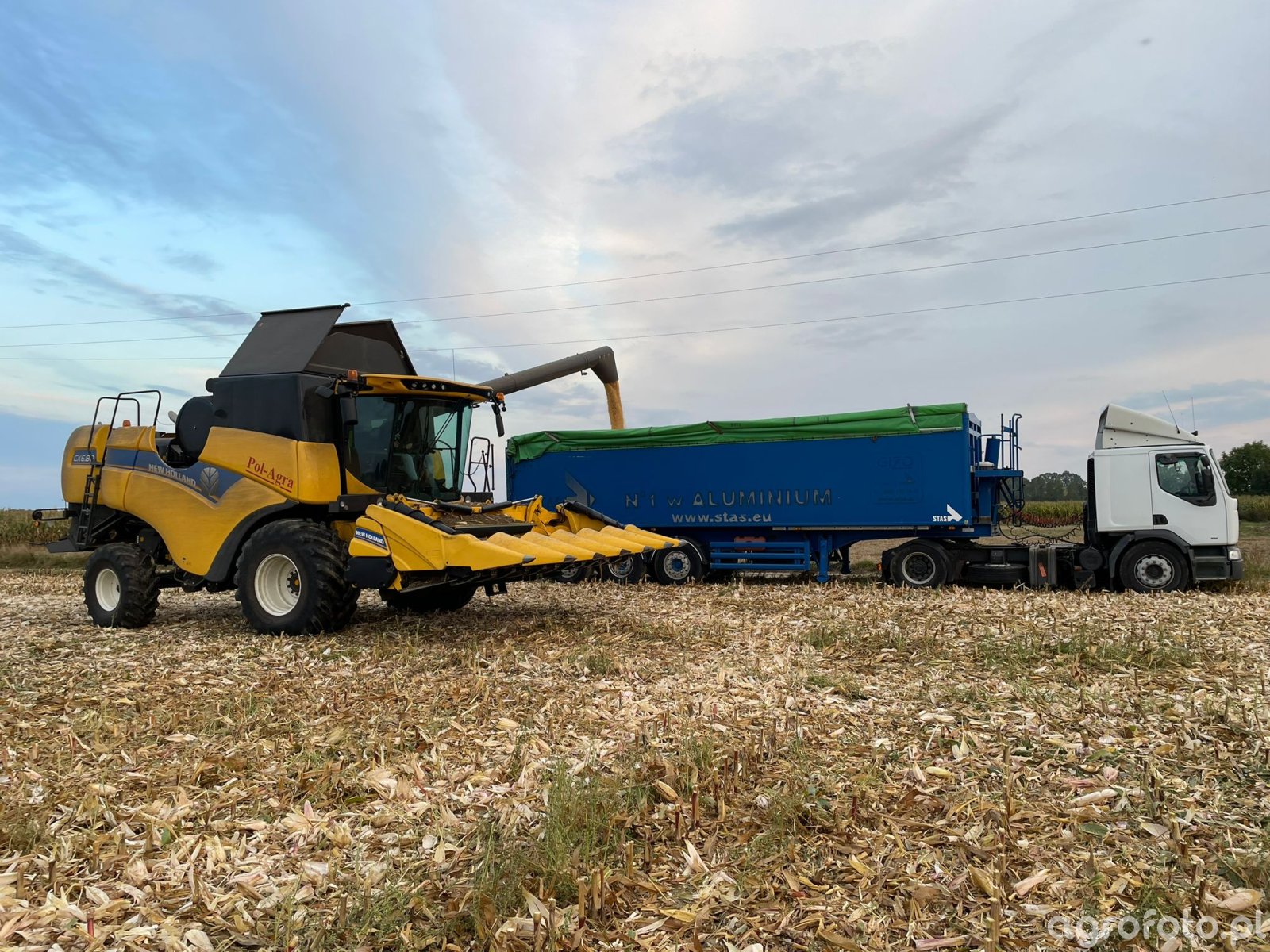 Kombajn New Holland CX6.80 podczas zbioru kukurydzy na ściernisku. Maszyna wyposażona w heder z dziobami, typowy dla zbioru kolb kukurydzy, pracuje w polu w warunkach typowych dla późnego lata lub wczesnej jesieni. Napędzany silnikiem o mocy 258 KM, kombajn ten posiada system omłotu konwencjonalnego, co zapewnia efektywną separację ziarna. Zbiornik o pojemności 9300 litrów umożliwia długie sesje zbiorcze bez konieczności częstych postojów. Charakterystyczna żółto-niebieska kolorystyka i logotyp New Holland podkreślają przynależność do serii Clayson, znanej z trwałości i wydajności w warunkach polowych. Obok kombajnu stoi ciężarówka do transportu ziarna, co wskazuje na intensywność prac żniwnych w rozległym obszarze rolnym.