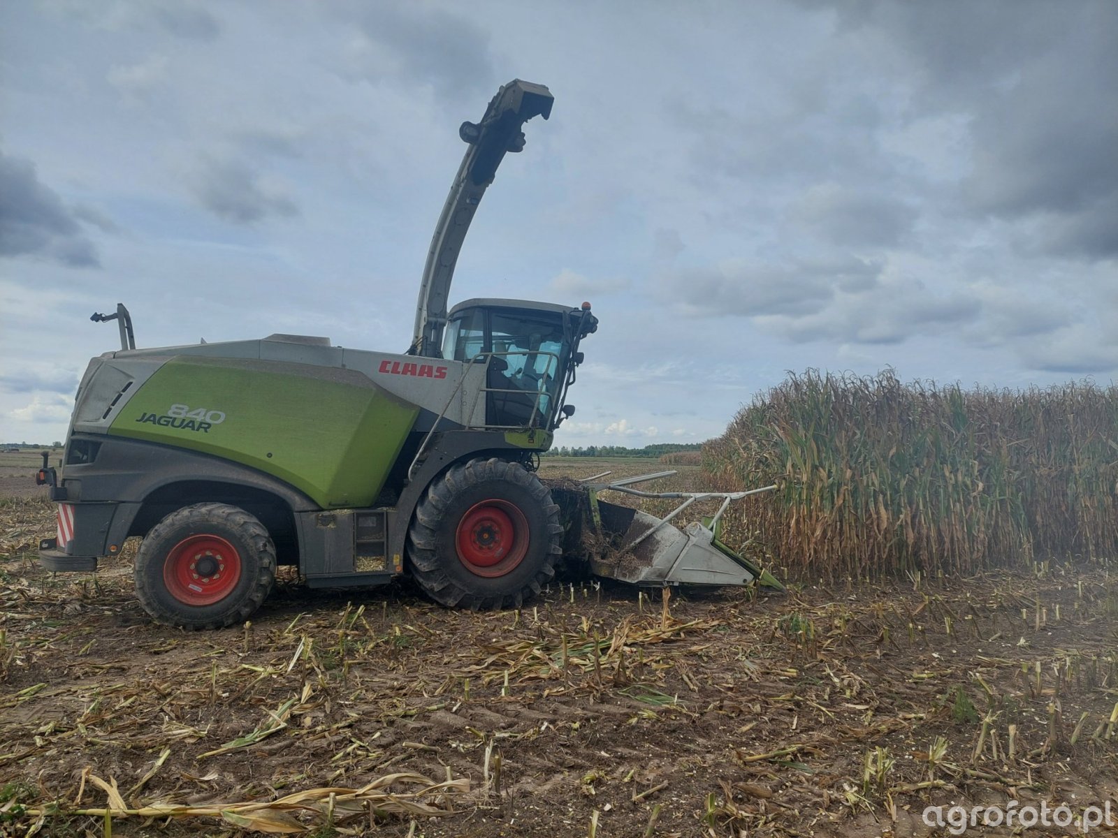 Claas Jaguar 840 podczas zbioru kukurydzy. Ta sieczkarnia polowa wyposażona w silnik Mercedes-Benz o mocy około 408 KM, cechuje się wydajnym sześciorzędowym hederem do kolb kukurydzy. System tnący Roto Cut umożliwia precyzyjne cięcie roślin i równomierne polowe rozdrabnianie zielonej masy, co wspiera optymalne przygotowanie kiszonki. Umieszczona na polu kukurydzy maszyna porusza się z dużą sprawnością, wykorzystując wysoką pojemność zbiornika na zielonkę, dostosowaną do potrzeb intensywnej pracy w sezonie zbiorów. Charakterystyczne zielono-czerwone barwy Claasa podkreślają solidność konstrukcji i innowacyjne podejście do inżynierii rolniczej, umożliwiając wydajne operacje w zmiennych warunkach atmosferycznych i terenowych.
