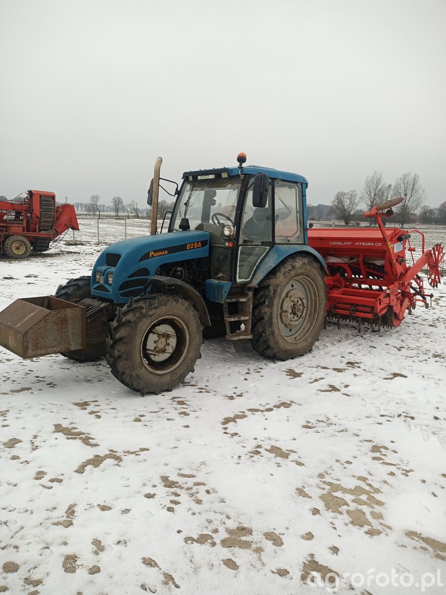 **Tytuł:** Pronar **Kategoria:** Pronar W zimowej scenerii, niczym niezłomny symbol polskiej siły, dumnie pręży się Pronar 82SA. Ten błękitny koń pociągowy, polska wariacja na temat legendarnego Białorusa, to uosobienie prostoty i pancernej wytrzymałości. Pod maską bije serce niezawodnego, czterocylindrowego silnika D-243 o mocy około 82 KM, któremu niestraszne trudne warunki. Widoczny na zdjęciu egzemplarz, z zamontowanym turem i doczepionym z tyłu nowoczesnym agregatem uprawowo-siewnym Amazone Combiliner Integra GII, jest w pełnej gotowości do każdej roboty w polu, od zimowego przeładunku po wiosenne siewy. Solidna blacharka i zabrudzone opony świadczą o jego ciągłej pracy w gospodarstwie. Ten nieśmiertelny wół roboczy wciąż trzyma cenę na rynku wtórnym – zadbane modele osiągają dziś od 35 do 60 tysięcy złotych, co jest najlepszym świadectwem jego nieocenionej wartości i niskich kosztów eksploatacji.
