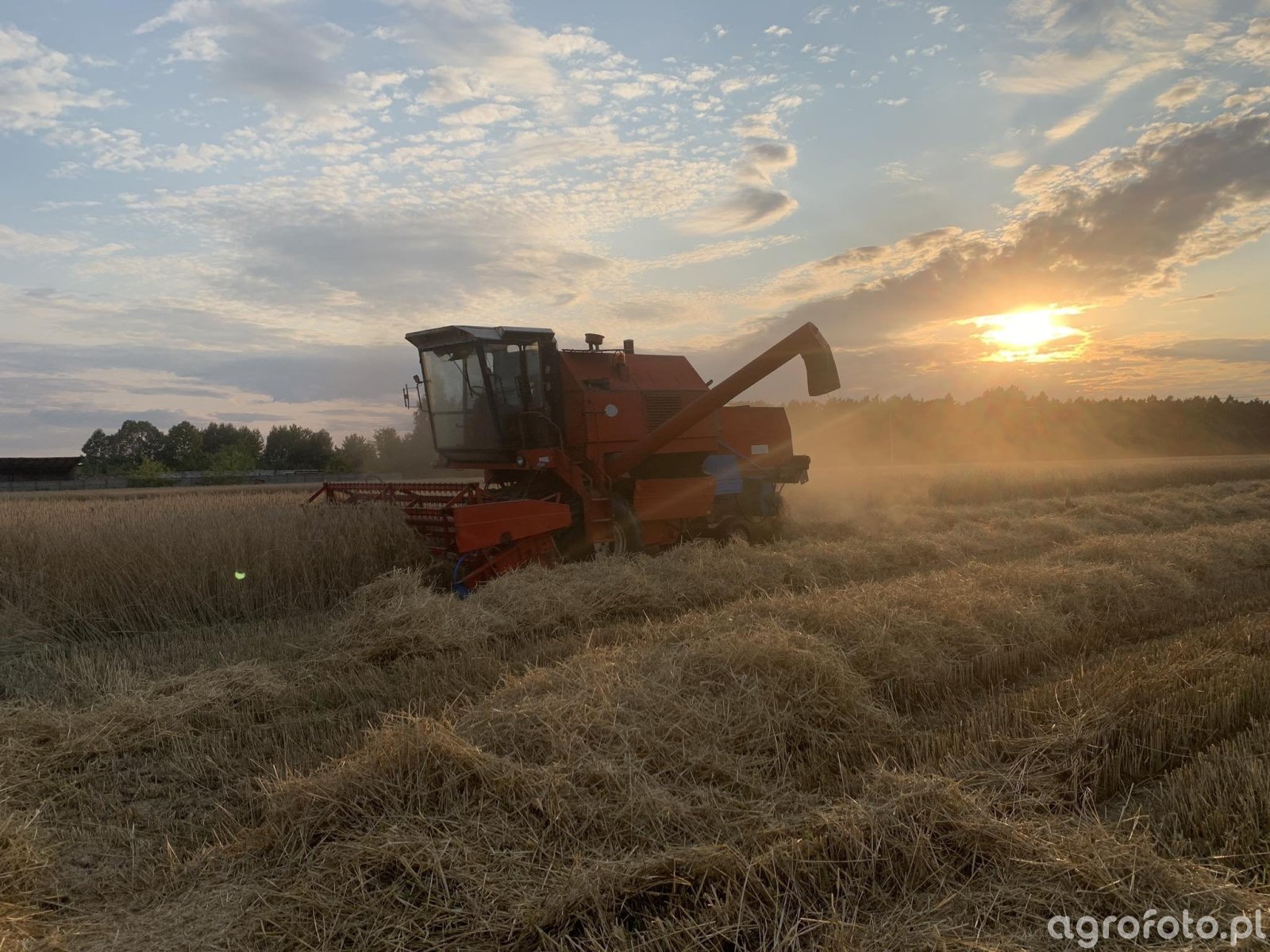 Kombajn Bizon Rekord podczas żniw na polu zboża przy zachodzie słońca. Ta maszyna, będąca symbolem polskiego rolnictwa, wyposażona jest w silnik o mocy około 150 KM oraz heder z motowidłami o szerokości roboczej 4,2 metra, umożliwiający efektywne koszenie zbóż. Zbiornik na ziarno o pojemności 3000 litrów pozwala na długotrwałą pracę bez konieczności częstego rozładunku. Bizon Rekord operuje na gąsienicach, co zapewnia stabilność i skuteczność w trudnych warunkach terenowych typowych dla polskich pól. Komfortowa kabina operatora z widokiem na pole gwarantuje precyzyjne prowadzenie podczas zbiorów, co czyni tę maszynę niezastąpionym narzędziem podczas sezonu żniwnego.