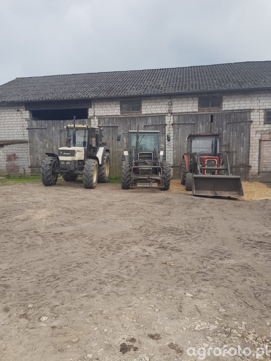 Ursus C-360 z serii C-4011–C-362, wyposażony w czterocylindrowy silnik wysokoprężny S-4003 o pojemności 3120 cm³ i mocy około 52 KM, stanowi centralny element zestawu ciągników ustawionych na placu gospodarstwa obok Renaulta i Lamborghini. Prosta, niesynchronizowana skrzynia biegów 6/2 pozwala na typowe prace polowe i transportowe, a masa własna około 2,2 t zapewnia wystarczającą stabilność przy współpracy z ładowaczem czołowym zamontowanym z przodu. Tylny trzypunktowy układ zawieszenia o udźwigu w granicach 1200–1300 kg umożliwia agregowanie klasycznych maszyn uprawowych, co dobrze wpisuje się w charakter parku maszynowego średniego gospodarstwa. Model C-360 produkowano w latach 1976–1994, a jego przybliżone ceny rynkowe w Polsce mieszczą się obecnie najczęściej w zakresie 18–35 tys. zł w zależności od stanu technicznego, wyposażenia dodatkowego i ewentualnych modernizacji.