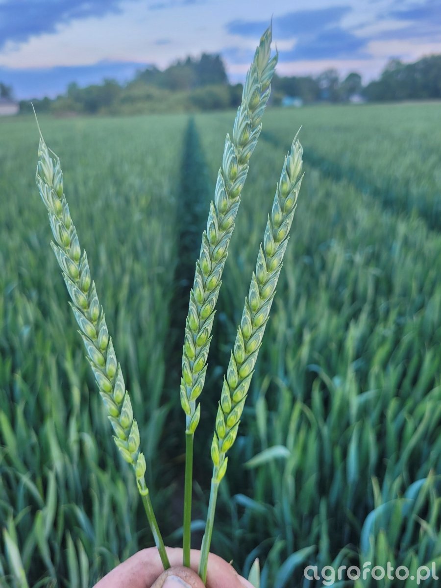 Pszenica ozima odmiany Patras w pełni wykształconych, zielonych kłosów, trzymanych nad łanem dla porównania wyrównania. Kłosy smukłe, dobrze wypełnione, z licznymi, wyraźnie uformowanymi kłoskami, bez widocznych objawów chorób kłosa czy uszkodzeń mechanicznych. Ziarniaki są jeszcze w fazie mleczno‑zielonej, tkanki soczyste, brak przebarwień sugerujących fuzariozę lub porażenie szkodnikami. Tło stanowi równomierny, gęsty łan pszenicy o intensywnej zieleni, z widocznym przejazdem technologicznym biegnącym przez środek pola. Brak oznak wylegania, niedoborów pokarmowych lub istotnych uszkodzeń liści, co wskazuje na dobrą kondycję plantacji w warunkach późnej wiosny.