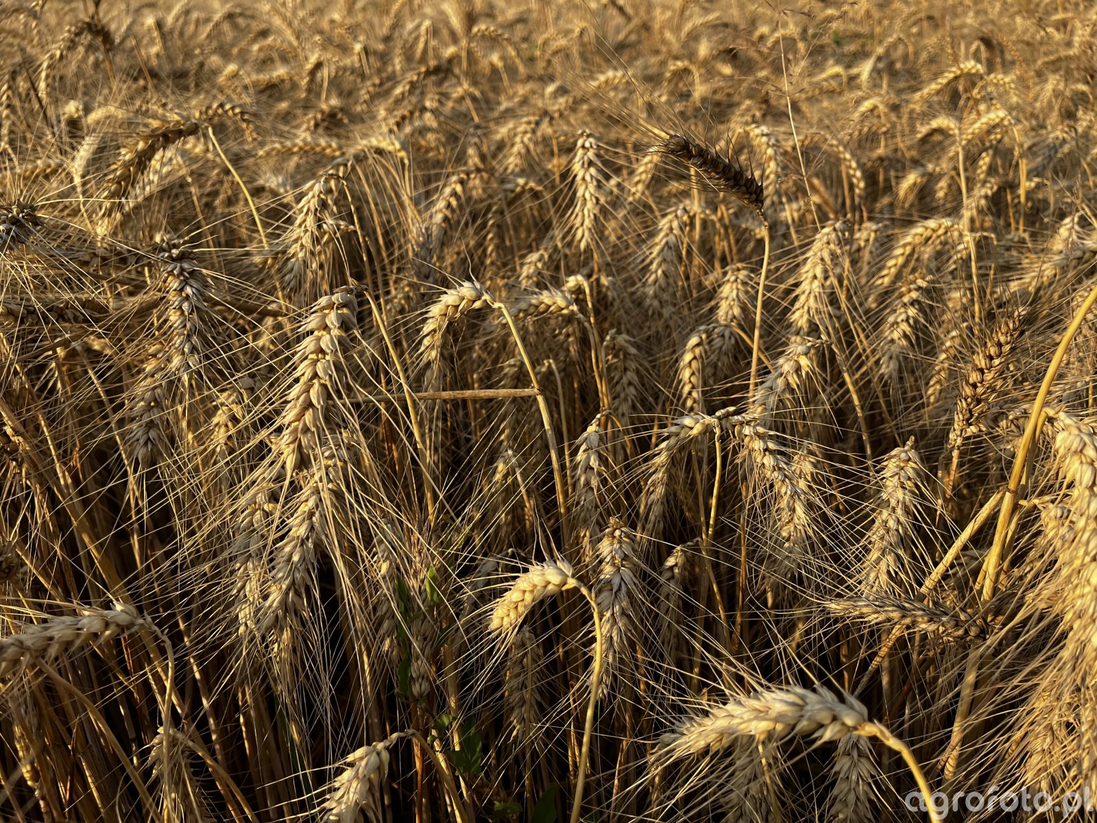 Letni łan pszenicy ozimej Wilejka w pełni dojrzałości, o równym, gęstym zwarciu. Kłosy długie, dobrze wypełnione, w większości pochylone pod ciężarem ziarna, o równomiernym, słomiano‑złotym wybarwieniu wskazującym na zakończone nalewanie. Ości liczne, cienkie, suche, bez widocznych przebarwień czy uszkodzeń mechanicznych. Źdźbła sztywne, proste, bez wylegnięcia, co sugeruje mocny łan i korzystne warunki dojrzewania. Brak objawów istotnych chorób kłosa, takich jak fuzarioza czy septorioza – plewy czyste, bez różowych nalotów, ciemnych plam czy zasychających fragmentów. Widoczna jednolitość dojrzałości wskazuje na bliskie żniwa w letnim terminie.