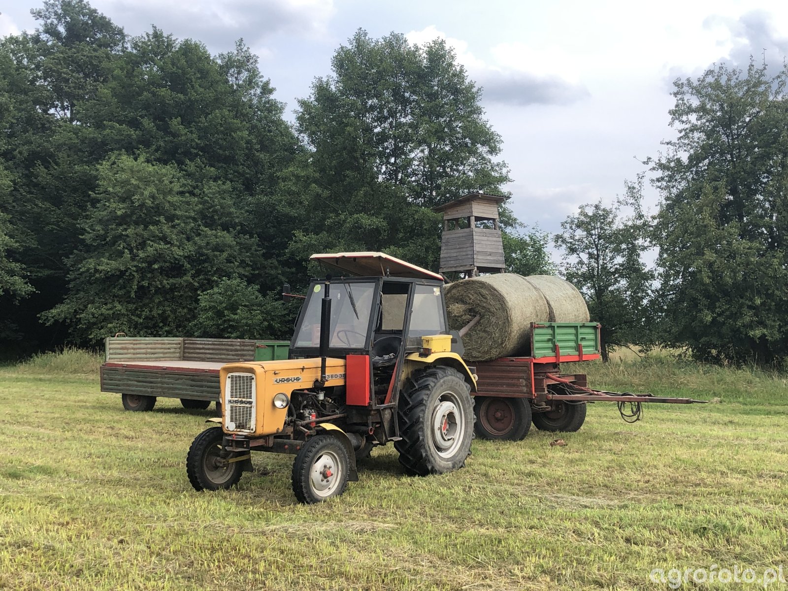 Ursus C-360-3P z trzycylindrowym silnikiem Perkins AD3.152 o pojemności 2,5 l i mocy około 47 KM pracuje w transporcie bel słomy na łące, współpracując z jednoosiową przyczepą rolniczą przystosowaną do przewozu ładunków objętościowych. Ciągnik wyposażony w mechaniczną skrzynię biegów 6/2, tylny most z blokadą mechanizmu różnicowego i hydraulikę z podnośnikiem o udźwigu około 1,2 t zapewnia wystarczającą siłę do bezpiecznego holowania załadowanej przyczepy w warunkach lekkiego terenu. Masa własna Ursusa C-360-3P wynosi około 2,1 t, co poprawia trakcję podczas ruszania z ładunkiem, a kompaktowe wymiary ułatwiają manewrowanie między stogami i na wąskich drogach dojazdowych. Model produkowany w latach 1981–1993 jest nadal popularny w małych i średnich gospodarstwach, a przybliżone ceny rynkowe zadbanych egzemplarzy w Polsce mieszczą się zazwyczaj w przedziale 25–40 tys. zł w zależności od stanu technicznego i wyposażenia.