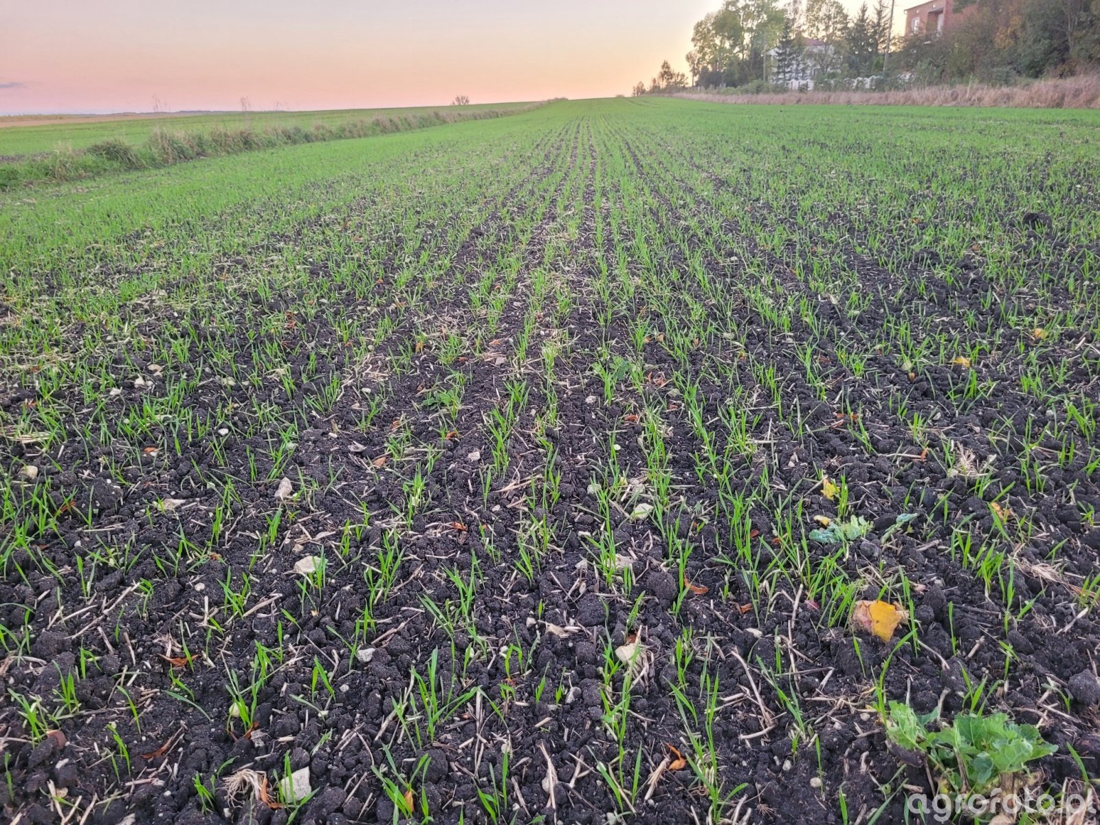 Jesienna plantacja pszenicy ozimej Pallas w równych, dobrze zarysowanych rzędach zajmuje cały kadr, sięgając aż po horyzont. Rośliny są w fazie wschodów: delikatne, jasnozielone siewki o kilku wąskich liściach wyrastają z ciemnej, wilgotnej gleby, lokalnie z widocznymi bryłkami i drobnymi resztkami pożniwnymi. Obsada wydaje się wyrównana, choć miejscami pojawiają się niewielkie prześwity między roślinami. W niektórych miejscach rosną pojedyncze chwasty dwuliścienne, lecz nie dominują łanu. W tle widoczny jest pas nieużytków i zabudowa gospodarstwa, a jesienne, lekko różowe niebo podkreśla sezonowy charakter pola po niedawnym siewie.