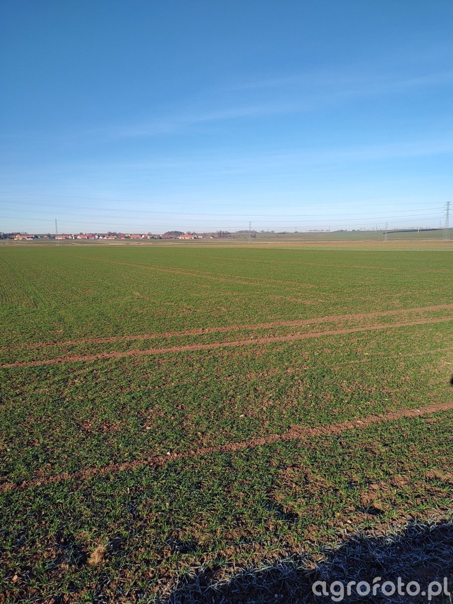 Zimowe stanowisko pszenicy ozimej w odmianie Pallas, równomiernie obsiane w szerokich łanach. Rośliny tworzą gęstą, zieloną darń z wyraźnie zarysowanymi rzędami siewu i ścieżkami technologicznymi, lokalnie widoczne są nieco słabsze pasy, gdzie gleba prześwituje mocniej. System korzeniowy i węzły krzewienia pozostają pod powierzchnią gleby, na wierzchu widoczne są jedynie części nadziemne bez oznak uszkodzeń mrozowych czy suszy. Brak objawów istotnych chorób grzybowych i szkodników; liście są zdrowe, bez przebarwień, plam czy ubytków tkanek. W tle rozległy, płaski krajobraz pól uprawnych, zabudowa wsi i linie energetyczne pod bezchmurnym, zimowym niebem.