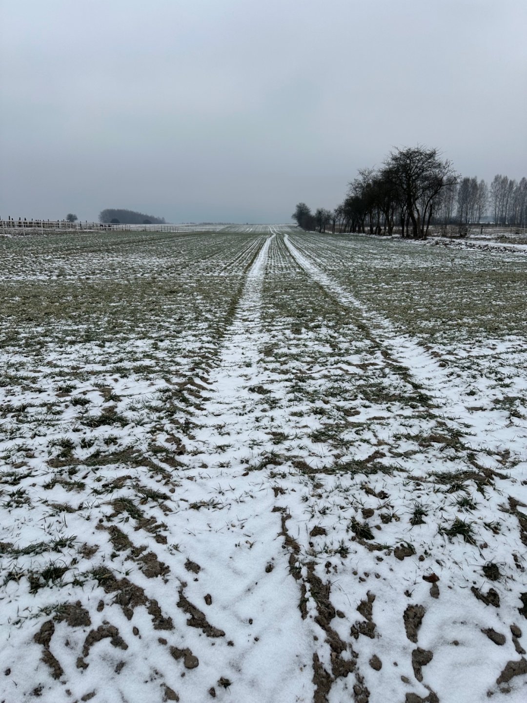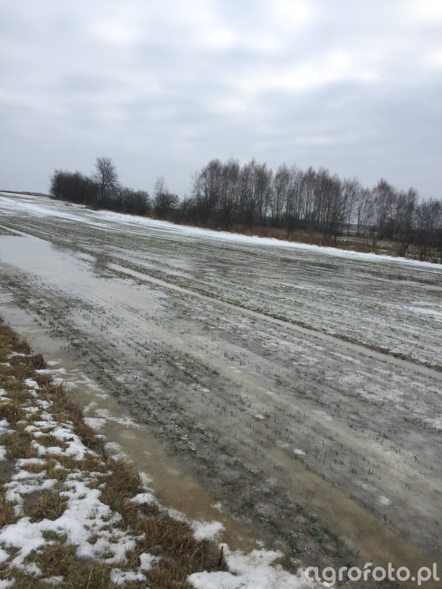 Zimowy łan pszenicy ozimej znajduje się pod silnym stresem wodnym po roztopach. Między rzędami roślin stoją rozległe zastoiska wody, miejscami zmieszanej z błotem, a powierzchnię gleby pokrywa nierównomierna warstwa topniejącego śniegu i lodu. Rzędy pszenicy są wyraźne, rośliny niskie, równomiernie wzeszłe, bez widocznych ubytków obsady ani objawów chorób czy żerowania szkodników; dominują liście intensywnie zielone, bez przebarwień. Skraj pola przechodzi w pas trwałej darni, a w tle widoczny jest pas bezlistnych drzew, typowy dla zimy. Warunki terenowe płaskie lub lekko nachylone sprzyjają zaleganiu wody na całej powierzchni plantacji.