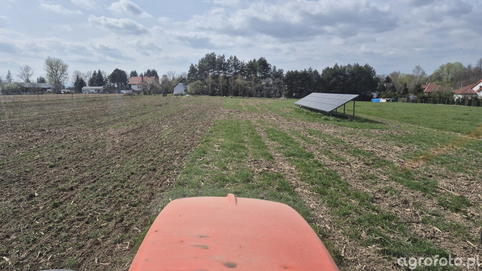 Wiosenne stanowisko po pszenicy w trakcie mechanicznego niszczenia łanu pod planowaną kukurydzę. W centrum kadr z maską ciągnika, przed nim pasy zielonej, nierównomiernie zachowanej darni po zbożu oraz resztki ścierni i łodyg po wcześniejszej uprawie, wskazujące na uproszczoną uprawę pożniwną. Lewa część pola już mocniej spulchniona, z przerywaną ruńą i odkrytą glebą, prawa bardziej zadarniona. Rośliny pszenicy są w fazie zaawansowanej wegetacji, ale bez szczegółowego rozróżnienia BBCH. Gleba średnio wilgotna, bez zastoisk wody, bez widocznych objawów chorób czy szkodników. W tle zabudowania, zadrzewienia i instalacja fotowoltaiczna na sąsiedniej działce. Data 12.04.2025 jednoznacznie wskazuje na warunki wiosenne.