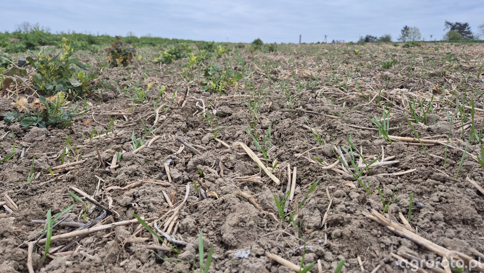 Wiosenne stanowisko pszenicy ozimej po doświadczeniu z głębokim siewem. W rzędach pojawiają się nieregularne wschody – młode rośliny z kilkoma wąskimi liśćmi, miejscami osłabione i przerzedzone, co potwierdza opóźnione kiełkowanie po umieszczeniu ziarna na około 6 cm. Gleba sucha, gruzełkowata, z licznymi resztkami pożniwnymi po uproszczonej uprawie, co sprzyja nierównemu ogrzewaniu profilu. Między rzędami silnie rozwinięte chwasty dwuliścienne, częściowo uszkodzone, prawdopodobnie po wcześniejszej regulacji chemicznej lub przymrozkach. Łan jest jeszcze w fazie wczesnych wschodów, bez widocznego krzewienia, a obsada pszenicy wyraźnie zredukowana względem zakładanej.