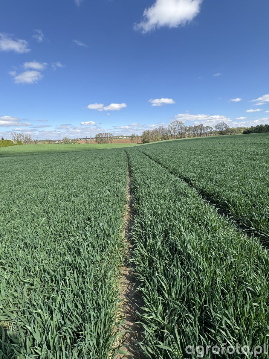 Pszenica ozima LG Keramik w fazie silnie rozkrzewionej, tworząca równy, gęsty łan o wyrównanej wysokości. Liście intensywnie zielone, bez widocznych przebarwień, nekroz czy objawów podstawowych chorób liści, takich jak mączniak czy septoriozy; pojedyncze żółknące fragmenty u podstawy roślin mieszczą się w typowym zakresie starzenia najstarszych liści. Rzędy są wyraźne, między nimi przejazdy technologiczne z odsłoniętą, lekko przesuszoną glebą mineralną. Pole położone na płaskim, rozległym terenie, w otoczeniu zadrzewień śródpolnych i mozaiki innych upraw. Warunki wiosenne – jasne słońce, chłodne, czyste niebo z rozproszonymi cumulusami, dobra widoczność i brak objawów stresu abiotycznego.