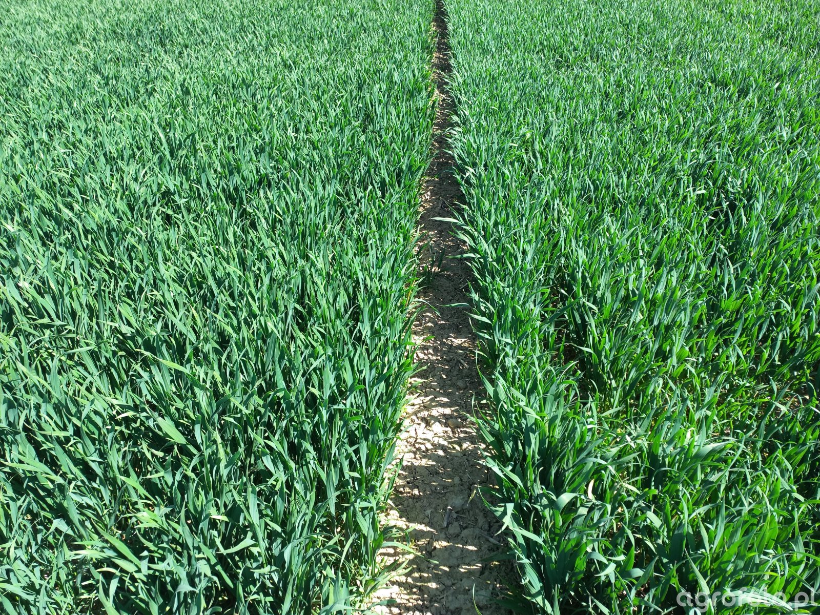 Pszenica ozima wiosną (początek maja), dwa wyraźnie oddzielone pasy odmianowe rozdzielone przejazdem technologicznym z odsłoniętą, przesychającą glebą mineralną. Po lewej stronie łan gęsty, mocno rozkrzewiony, z liśćmi nieco dłuższymi, luźniej ułożonymi, o nieco jaśniejszym, lekko matowym odcieniu zieleni – zgodnie z opisem odmiana Pallas. Po prawej stronie odmiana Elektra: rośliny podobnej wysokości, nieco ciaśniej ustawione, o bardziej wzniesionych źdźbłach i ciemniejszej barwie liści, tworzące równy, zwarty łan. Brak widocznych objawów chorób liści, uszkodzeń szkodnikami czy niedoborów pokarmowych; plantacja wyrównana, bez przerw w obsadzie.