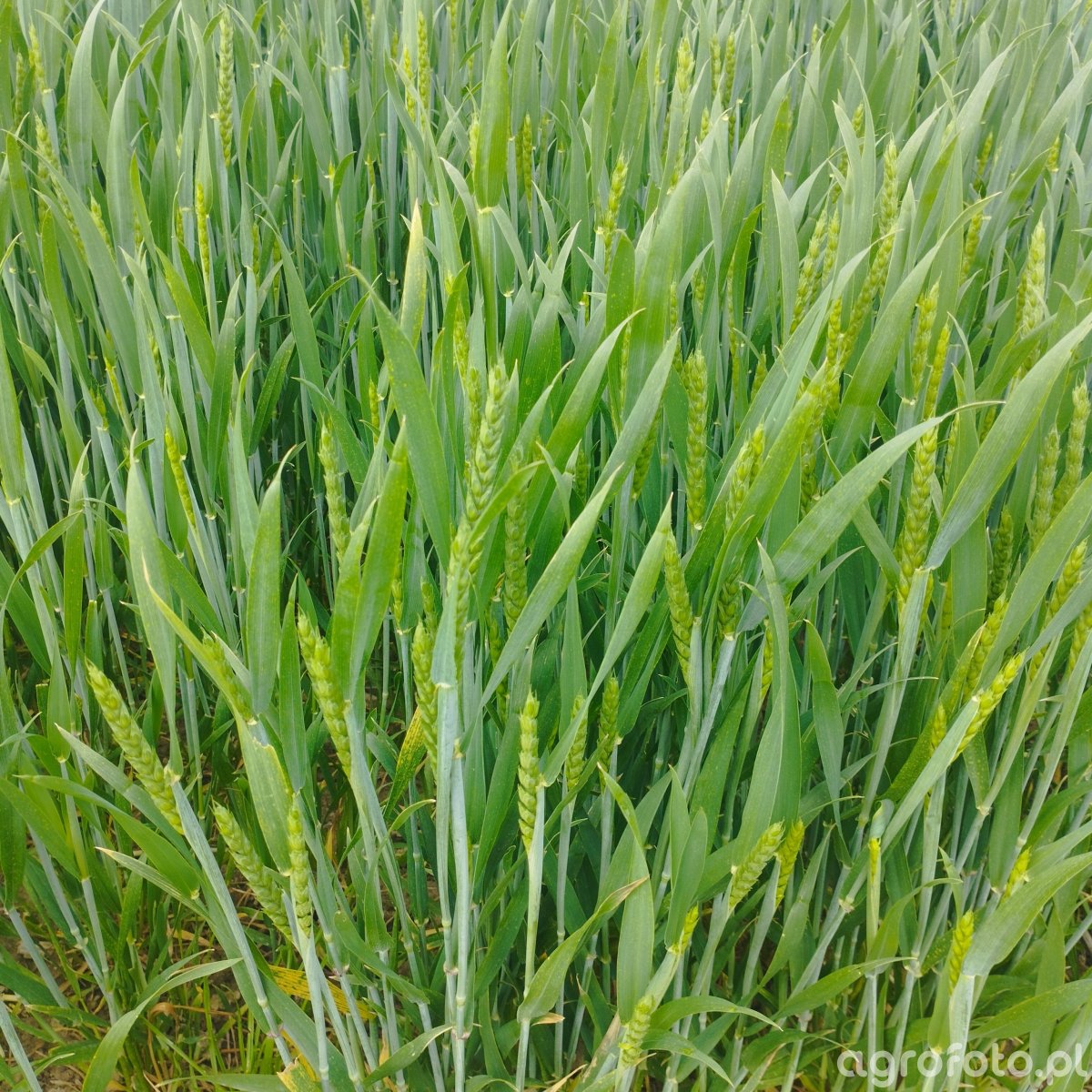 Pszenica ozima w pełni wiosennej wegetacji, łan gęsty i równomierny, z dobrze wykształconymi, zielonymi źdźbłami. Większość roślin ma już wysunięte, jasnozielone kłosy, część pozostaje jeszcze częściowo ukryta w pochwach liściowych, co wskazuje na niejednorodność w dojrzewaniu pędów. Liście długie, lancetowate, bez widocznych nekroz czy plam, miejscami z lekkimi przebarwieniami brzegów, mogącymi wynikać z wcześniejszych warunków pogodowych lub mechanicznych uszkodzeń. Brak objawów charakterystycznych chorób grzybowych i brak widocznych szkodników. Gleba całkowicie zasłonięta, co ogranicza zachwaszczenie i parowanie wody, typowy obraz dobrze prowadzonych pszenicznych łanów późną wiosną.