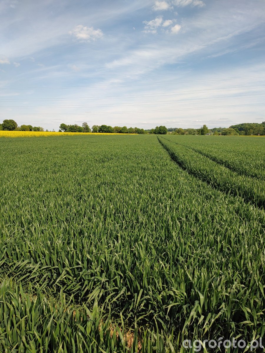 Wiosenne ujęcie łanu pszenicy odmiany Pallas, równomiernie zwartej na całej powierzchni pola. Rośliny dobrze rozkrzewione, tworzą gęsty, ciemnozielony łan bez widocznych przerzedzeń ani pustych placów. Liście intensywnie wybarwione, bez objawów chloroz, nekroz czy przebarwień typowych dla chorób grzybowych; brak widocznych uszkodzeń mechanicznych i śladów żerowania szkodników. W tle widoczny pas żółto kwitnącego rzepaku oraz pas drzew oddzielający kolejne pola, nad nimi linia energetyczna. Przez środek łanu biegną wyraźne koleiny po opryskiwaczu, wskazujące na wcześniejszy przejazd zabiegowy wykonywany już w trakcie wiosennej wegetacji.
