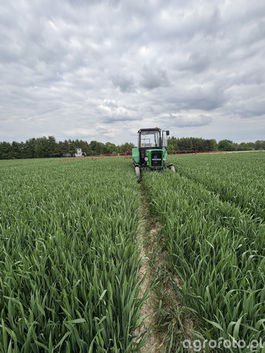 Pszenica ozima KWS Donovan w pełni wiosennej wegetacji, łan równy, gęsty, o intensywnie zielonych liściach, bez widocznych przebarwień ani ubytków świadczących o chorobach grzybowych czy żerowaniu szkodników. Rośliny tworzą zwarte międzyrzędzia, wysokość sugeruje zaawansowane krzewienie, ale bez wykształconych kłosów, dlatego dokładnej fazy BBCH nie da się określić. Przez środek pola biegnie wyraźna ścieżka technologiczna z połamanymi i przygniecionymi kępami wzdłuż przejazdu. W ścieżce porażenia, zachwaszczenia ani samosiewów nie widać, dominuje pszenica. W tle pas drzew stanowiący naturalną ochronę przed wiatrem oraz zabudowania siedliskowe. Pochmurne, majowe niebo potwierdza typowe warunki wiosenne.