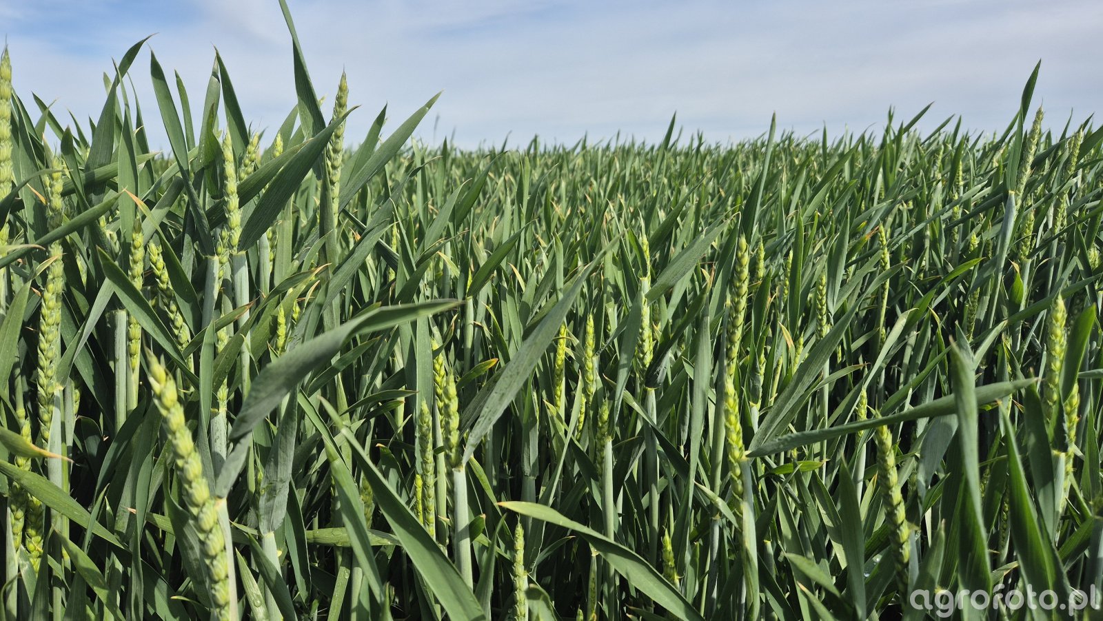 Łan pszenicy ozimej Andorre w pełni wiosny tworzy bardzo wyrównaną, gęstą plantację, bez widocznych przerw w obsadzie. Rośliny dobrze rozkrzewione, z licznymi, długimi źdźbłami zakończonymi jasnozielonymi kłosami, w większości wysuniętymi ponad liście. Liście flagowe i podflagowe są wydłużone, o intensywnej, żywozielonej barwie, bez wyraźnych objawów niedoborów czy uszkodzeń mechanicznych. Na blaszkach nie widać charakterystycznych plam czy nekroz, brak też oznak porażenia rdzą, septoriozą lub mączniakiem – pojedyncze końcówki liści lekko zasychają, co może wynikać z naturalnego starzenia się starszych pięter liściowych. Tło stanowi równomierny, zwarty łan sięgający horyzontu pod jasnym, wiosennym niebem.