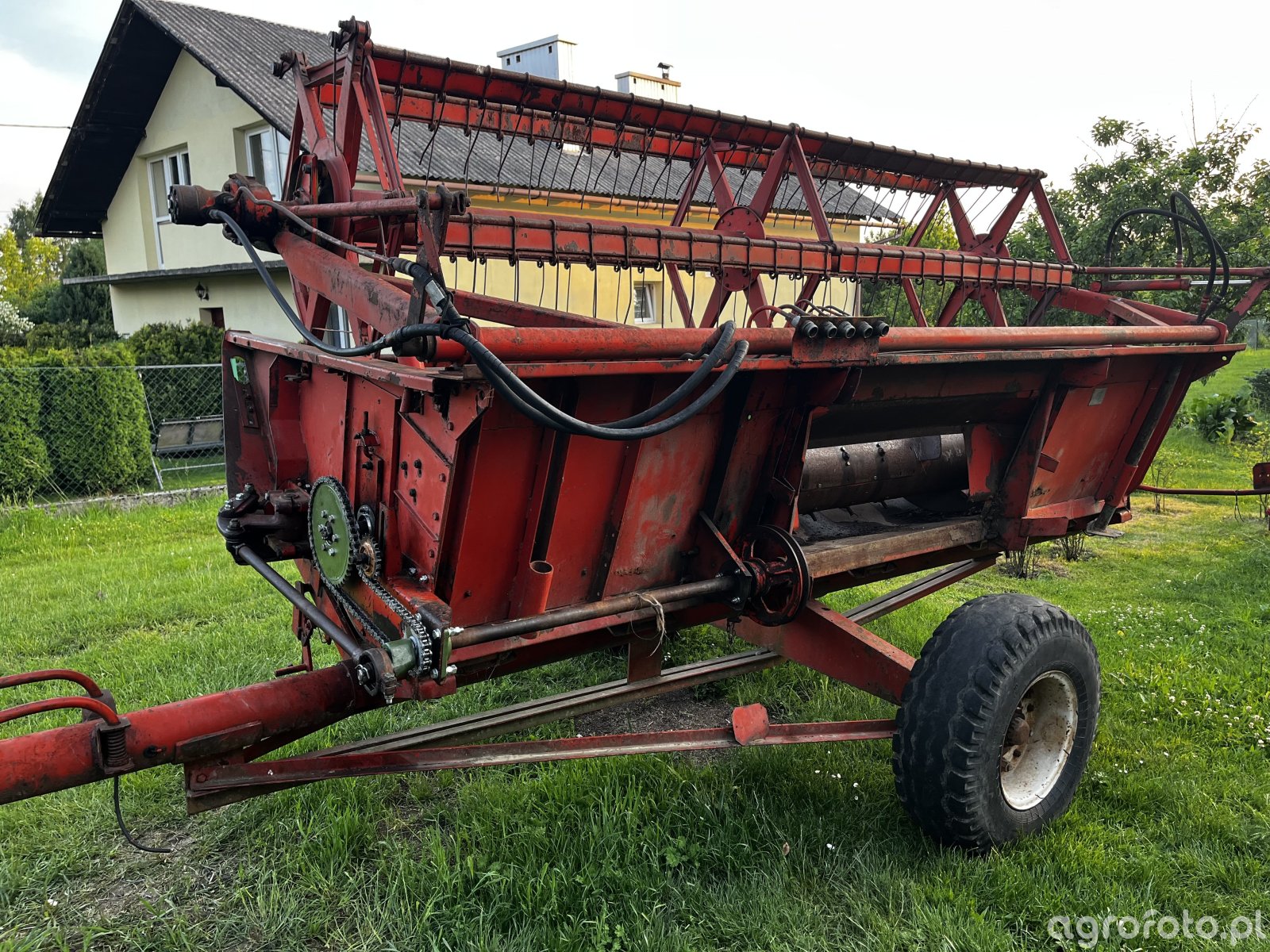 Kombajn Bizon Z056, widoczny na zdjęciu, jest wyposażony w heder z motowidłami o szerokości 3,6 metra, co wskazuje na jego przeznaczenie do koszenia zbóż. Maszyna znajduje się na placu gospodarstwa, prawdopodobnie przygotowana do kolejnych prac żniwnych. Bizon Z056, znany z wytrzymałej konstrukcji, jest napędzany silnikiem S4002 o mocy 100 KM, co zapewnia wystarczającą siłę do efektywnego działania w różnych warunkach polowych. Klasyczny system omłotu bębnowego w połączeniu z pojemnym zbiornikiem na ziarno, wynoszącym około 3 000 litrów, umożliwia kombajnistom wydajną i nieprzerwaną pracę podczas zbiorów. Czerwona kolorystyka i charakterystyczny układ konstrukcji hedera podkreślają jego przynależność do serii Bizon, popularnej wśród polskich rolników.