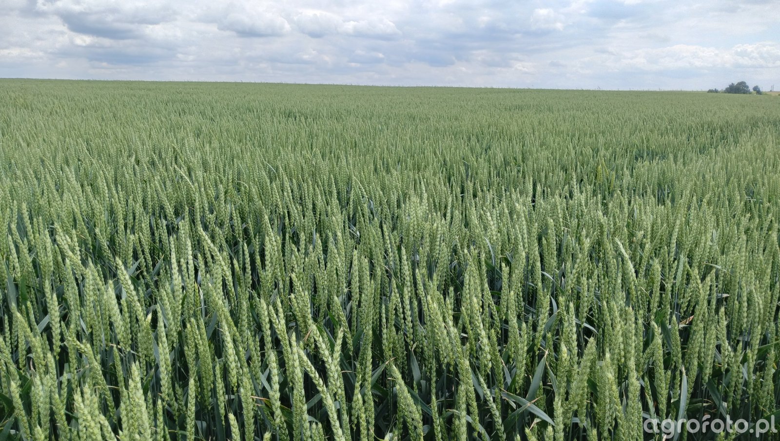 Rozległa plantacja pszenicy ozimej w pełni lata, łan równy i gęsty, kłosy dobrze wykształcone, w jednolitym, jasnozielonym kolorze. Rośliny osiągają wyrównaną wysokość, bez widocznych wylegnięć czy przerzedzeń, co świadczy o dobrej obsadzie i równomiernych wschodach. Kłosy są już całkowicie wysunięte, jednak ziarno pozostaje zielone, bez oznak dojrzałości woskowej. Liście flagowe proste, zdrowe optycznie, bez wyraźnych objawów septorioz, rdzy czy mączniaka; brak także widocznych uszkodzeń żerowaniem szkodników. Pole utrzymane w monokulturze pszenicy, bez domieszki chwastów ponad łanem, sięgające horyzontu pod lekkim, letnim zachmurzeniem.