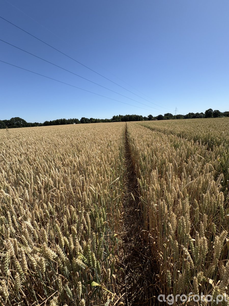 Letnie ujęcie łanu pszenicy ozimej KWS Donovan w pełni dojrzałości technologicznej, z wyraźnym przejazdem technologicznym biegnącym przez środek pola. Kłosy są mocno wykształcone, w większości słomkowo‑żółte, miejscami jeszcze lekko zielonkawe u nasady, co wskazuje na końcową fazę dojrzewania ziarna. Rośliny stoją równo i gęsto, bez widocznych wylegnięć, jedynie pojedyncze źdźbła pochylone nad koleiną. Brak wyraźnych objawów chorób liści czy kłosów, nie widać też szkód od szkodników. Podłoże w przejeździe suche, między resztkami słomy przebijają pojedyncze chwasty. Tło zamyka linia drzew oraz słupy i przewody energetyczne pod bezchmurnym, letnim niebem.