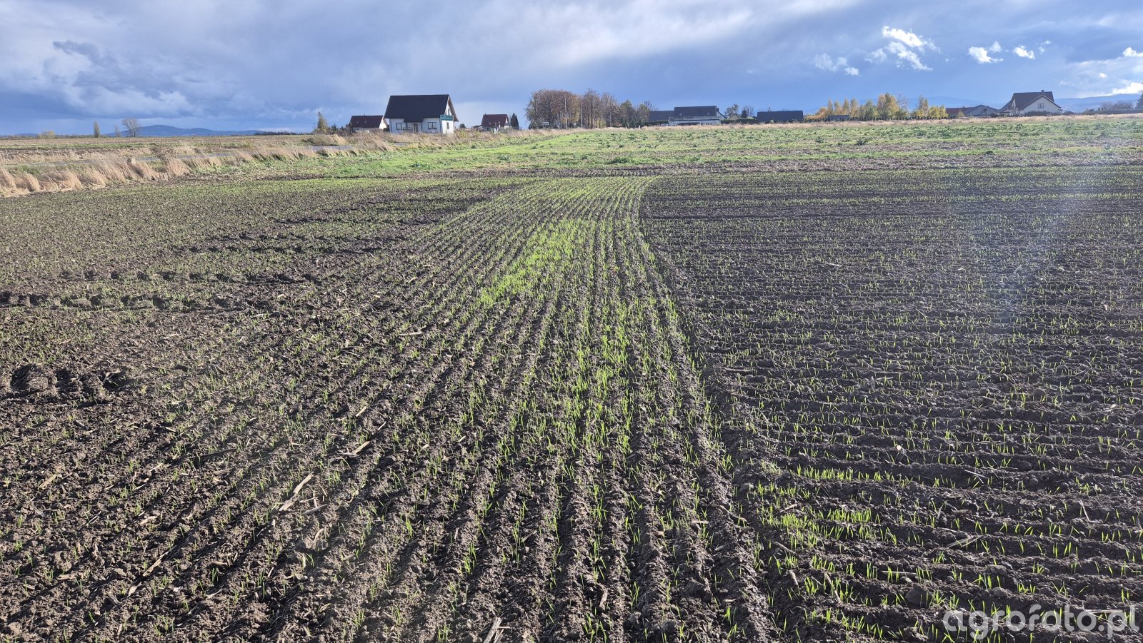 Jesień, pszenica ozima Andorre po rzepaku, siew z 11 października, obecnie równomierne wschody w rzędach przy zakładanej obsadzie 250 roślin/m². Gęstość roślin wydaje się zbliżona do planowanej, międzyrzędzia czytelne, bez wyraźnych przerw. Rośliny w fazie kilku liści właściwych, liście wyprostowane, o wyrównanej długości, bez widocznych objawów stresu wodnego czy uszkodzeń mechanicznych. Barwa liści intensywnie zielona, bez przebarwień sugerujących niedobory składników pokarmowych lub porażenie chorobowe. Powierzchnia gleby typowa dla stanowiska po rzepaku, z resztkami pożniwnymi równomiernie rozmieszczonymi w międzyrzędziach, bez zastoisk wody i zaskorupienia, co sprzyja dobremu rozwojowi systemu korzeniowego.