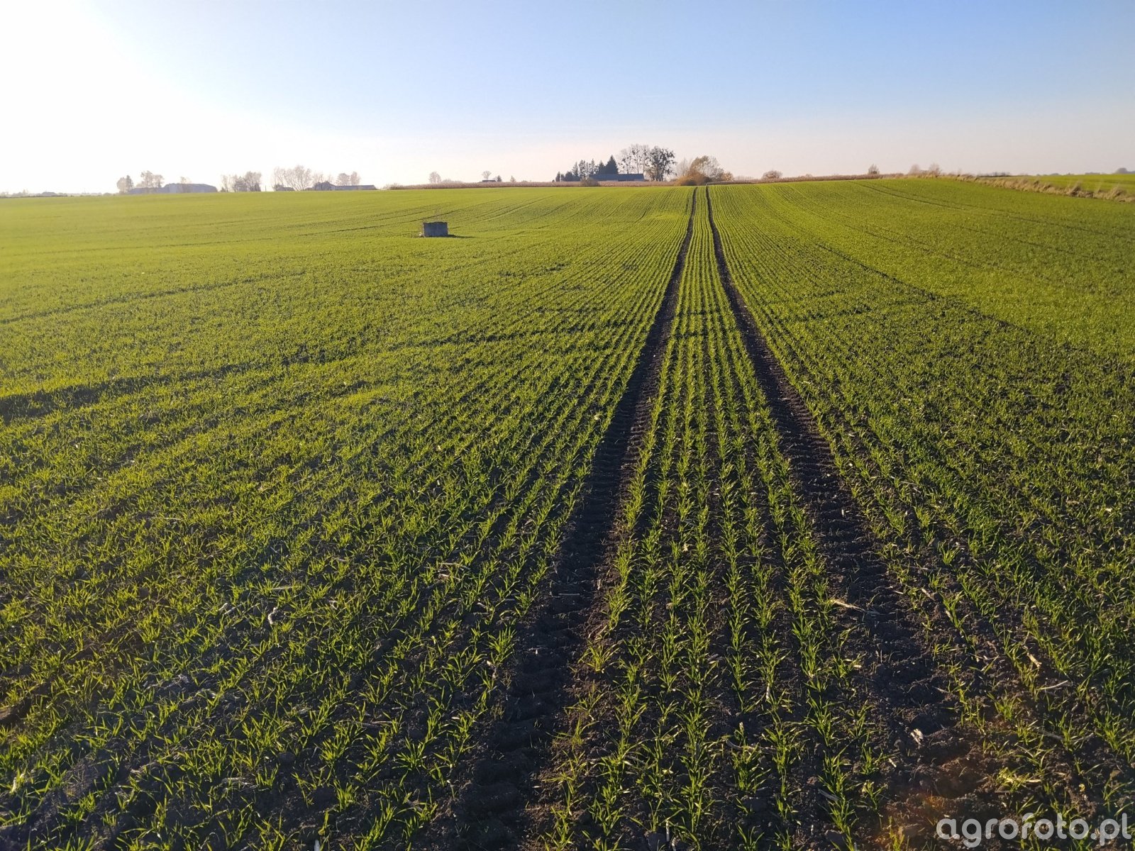 Pszenica ozima odmiany Vistula tworzy r贸wnomierny, intensywnie zielony 艂an na du偶ej, p艂askiej dzia艂ce. Widoczna jest g臋sta, wyr贸wnana obsada w wyra藕nych rz臋dach, z zachowanymi 艣cie偶kami technologicznymi, kt贸re u艂atwi膮 wiosenne wjazdy na pole. Ro艣liny maj膮 ju偶 kilka li艣ci, bez dostrzegalnych uszkodze艅 mrozowych ani objaw贸w chor贸b li艣ci czy 偶erowania szkodnik贸w. Mi臋dzy rz臋dami pozostaje jeszcze nie w pe艂ni przykryta gleba, ciemna, bez widocznej skorupy, co sprzyja dalszemu rozwojowi systemu korzeniowego. W tle obszar zadrzewie艅 i zabudowa wiejska, niebo bezchmurne, co przy dacie wykonania zdj臋cia wskazuje na stabilne, zimowe warunki sprzyjaj膮ce bezpiecznemu przezimowaniu pszenicy.