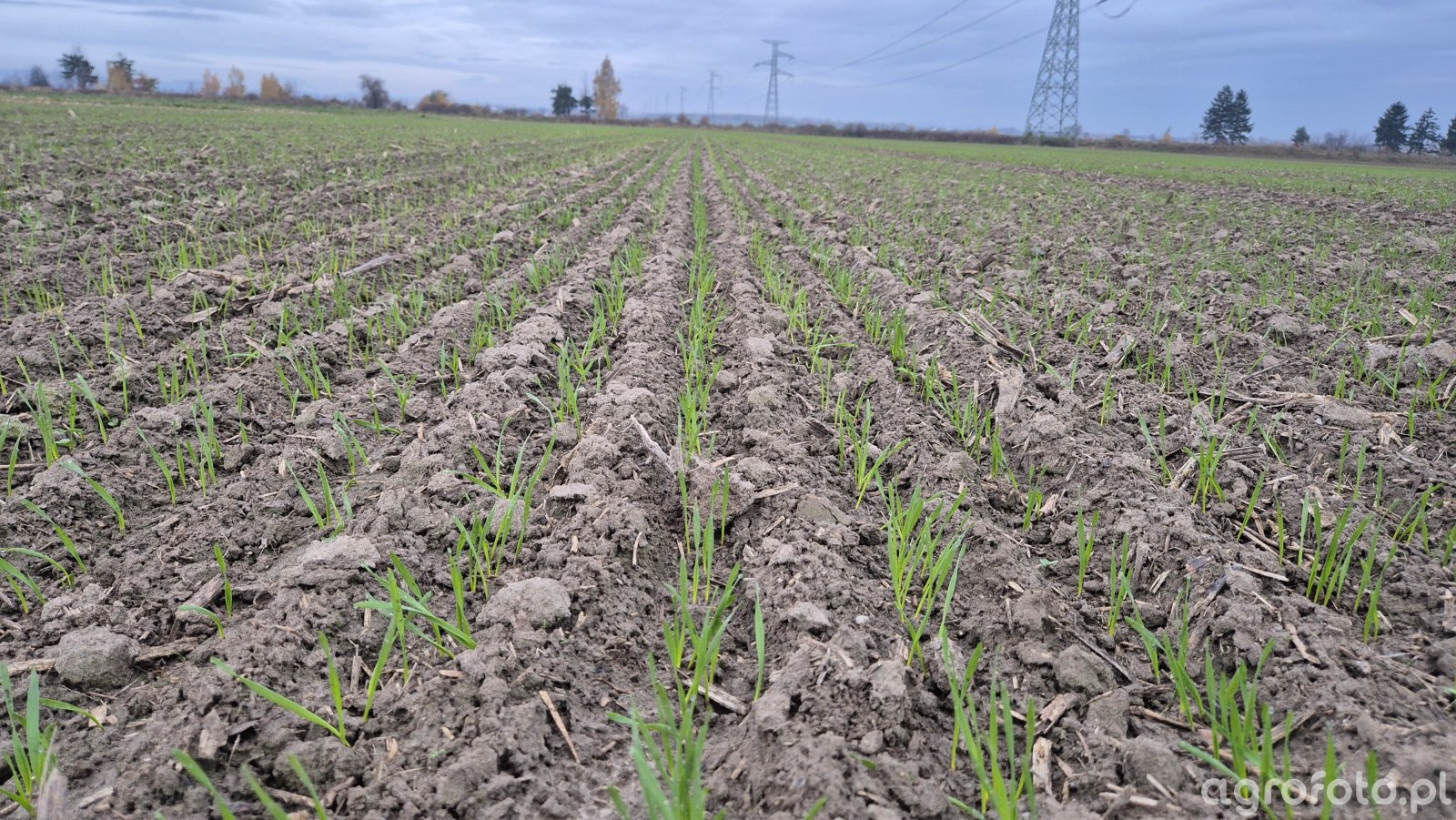 Jesień, pszenica ozima Andorre trzy tygodnie po siewie w równych, wyraźnie zarysowanych rzędach. Rośliny w fazie wczesnych wschodów, z przewagą pierwszych liści; długość liści i ich intensywna zieleń świadczą o dobrym wigoru i braku widocznych objawów niedoborów czy chorób grzybowych. Obsada zapowiada się zgodnie z założeniem 250 roślin/m² – prześwity między roślinami są niewielkie i równomiernie rozmieszczone. Gleba ciemna, umiarkowanie wilgotna, z drobną bryłkowatą strukturą, lokalnie widoczne resztki pożniwne po przedplonie. Brak nalotu pleśniowego, brak uszkodzeń od szkodników glebowych czy powierzchniowych. Tło z rozmytą linią horyzontu podkreśla równomierny charakter łanu na całej powierzchni pola.