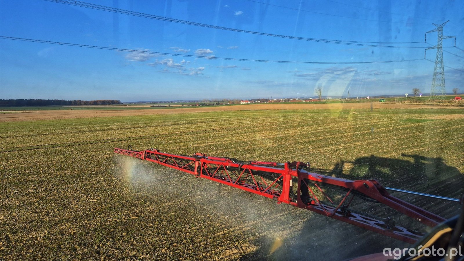 Opryskiwacz polowy Hardi Master z belką roboczą w pozycji roboczej przeprowadza zabieg herbicydowy na równo obsianym polu zbóż ozimych w początkowej fazie rozwoju. Widoczne rośliny tworzą wąskie, równoległe rzędy młodych siewek z pojedynczymi liśćmi, co odpowiada wczesnym fazom wzrostu pszenicy ozimej; szczegółowe rozpoznanie odmiany Andorre nie jest możliwe na podstawie obrazu. Gleba między rzędami pozostaje w dużej mierze odsłonięta, bez wyraźnie rozwiniętej konkurencji chwastów. Warunki pogodowe sprzyjające pracy – sucha powierzchnia pola, dobra widoczność i brak opadów – uzasadniają wybór herbicydu doglebowego zastosowanego już w fazie 1–2 liści, zamiast pierwotnie planowanego oprysku nalistnego na późniejszym etapie rozwoju.
