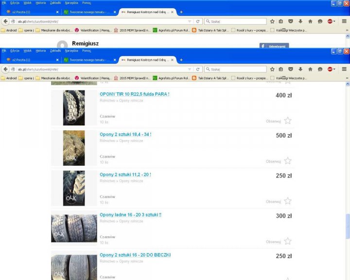Witam, Kulawa_koza ! Niestety , nowymi nie handlujemy , a używane w tak dobrym stanie ciężko będzie znaleźć . Aktualnie doszły opony: Ładna para 16-20 Para 750 R20 , tanio! 18,4 R34 Para ! Okazja! 540/ 65 R34 Trelleborg , Para! Jak 18,4R34 tylko szersze o 2cm na strone . 750/65R26 Para ! (28LR26) Do kombajnu! Wzmacniane przody dzięki technologii Michelin XBIB. Zapraszam do kontaktu ! Remigiusz Bartoszek Jr. tel: 608 372 122 Moje ogłoszenia na OLX można znaleźć szukając opony rolnicze w miejscowości Czarnów gm. Górzyca W razie potrzeby daję więcej zdjęć na maila . -