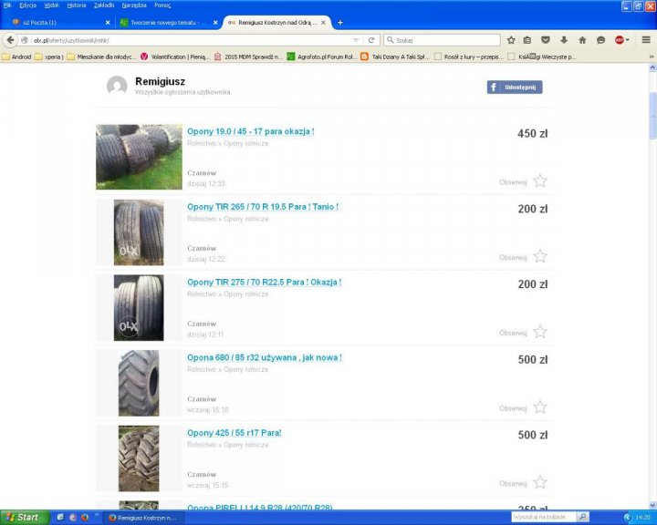 Witam ! Oferuję opony rolnicze do : -ciągników -naczep -kombajnów -beczek i innych sprzętów Przykładowe aktualne oferty załącze jako zrzut ekranu z olx'a Znajdujemy się w Czarnowie k. Kostrzyna nad Odrą . Jeśli trzeba wystawiamy umowę kupna sprzedaży. Jest również możliwość wysyłki w dobrej cenie (do 220zł przy przedpłacie na konto ) . Jeśli trzeba wysyłamy dokładne zdjęcia opon na e-mail , najważniejsze dla nas , by klient był dobrze poinformowany , w jakim stanie są opony , zgodnie ze stanem faktycznym. Pozdrawiam! Remigiusz Bartoszek Jr. tel: 608 372 122 Remigiusz@fejm.pl