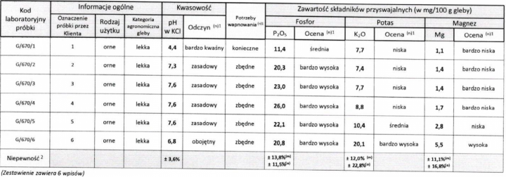 Powiedzcie mi, wyniki wyszły jak w załączonym obrazie. Wczesną wiosną chcę zastosować albo Korn-Kali, albo kizeryt z solą potasową. Który nawóz/mieszanka nawozów będzie lepsza? Przedsiewnie nie był dawany nawóz, tylko obornik około 40t/ha(oprócz nr na wynikach 5 i 6).
