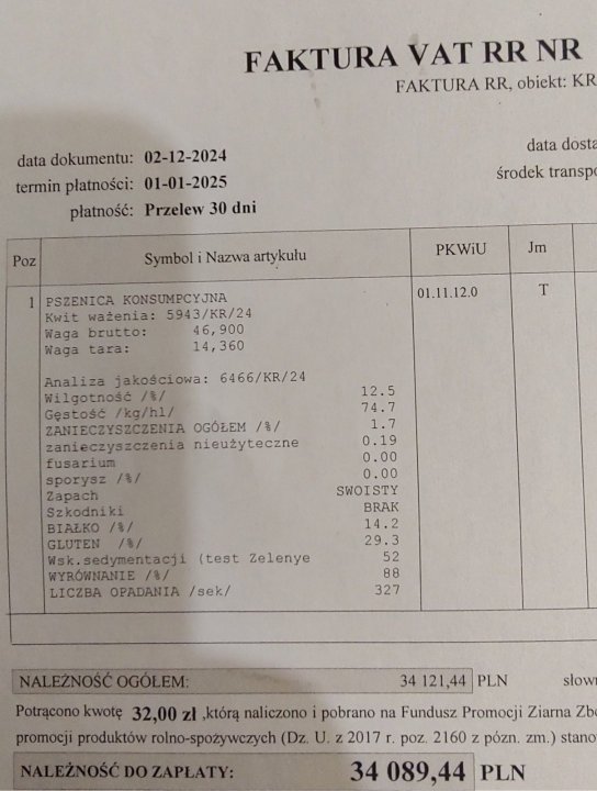 Chciałem bardzo przeprosić szanownych co najmniej 100 przedmówców, że piszę nie w temaciem ale nie znalazłem nic odpowiedniejszego . Dziś wykonałem drugą niezależną analizę próbki pszenicy. Wyszło podobnie jak wcześniej. Jak w załaczniku. 960 brutto to chyba ciut za mało jak nawet na obecne ceny z podwórka? Lubelskie.