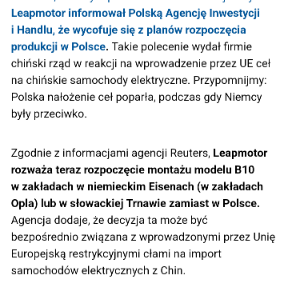 To że w Polsce produkuje się części do samochodów ,to fakt ale " ta wielkość produkcji " baterii szczególnie do elektryków " to duuuuuża przesada bo prym wiodą Chińczycy . Produkcja części to też nie jest taka rozwojowa ,bo era samochodów spalinowych dobiega końca, np Mercedes przeniósł całą produkcję diesla do Polski ,a ta niedługa potrwa bo ekologią wprowadza ograniczenia., W interesie Polski było dogadywanie się z Chińczykami ,a jeżeli chcieli wdrażać technologie u nas ,to tego trzeba było tego pilnować . Wprowadzenie cła dotyczy samochodów elektrycznych ,co dla Polski nie na wielkiego znaczenia , wykazaliśmy jako kraj troskę o rynek Niemiecki ,,kiedy to sami Niemcy mieli inne priorytety, a może to tylko taka zasłona dymna .😉 Niemcy potrzebowali czasu aby nadrobić dystans do Chin ( w kwestii elektryków) i mają ten czas i jednocześnie mogą się tłumaczyć " co złego to nie my ".