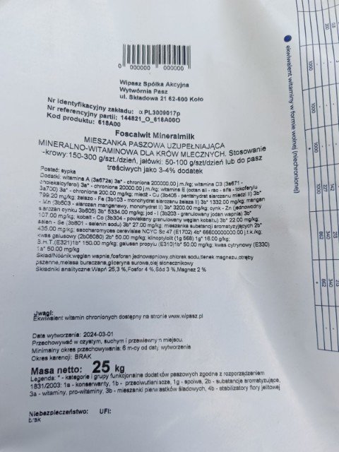 200g takiego czegoś, jakieś 100g kredy i sól do woli. Wydajności nie powala to i zapotrzebowania chyba też wielkiego nie ma. Ze zmian to sianokiszonkę tegoroczną zacząłem.