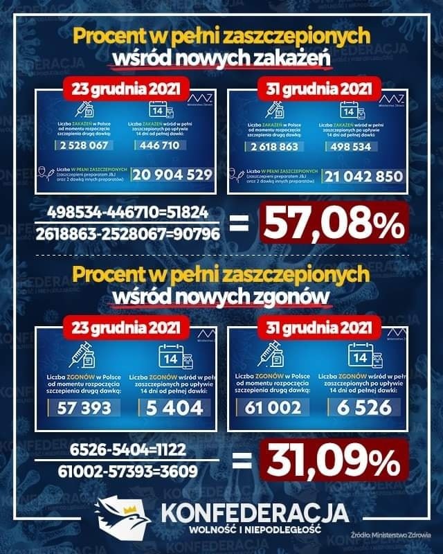 Tego Wam główne media t5z, k@rwowizja i rządzący nie powiedzą. Według danych z Ministerstwa Zdrowia przez minione 7 dni osoby zaszczepione stanowią 57% zakażeń oraz 31% zgonów.