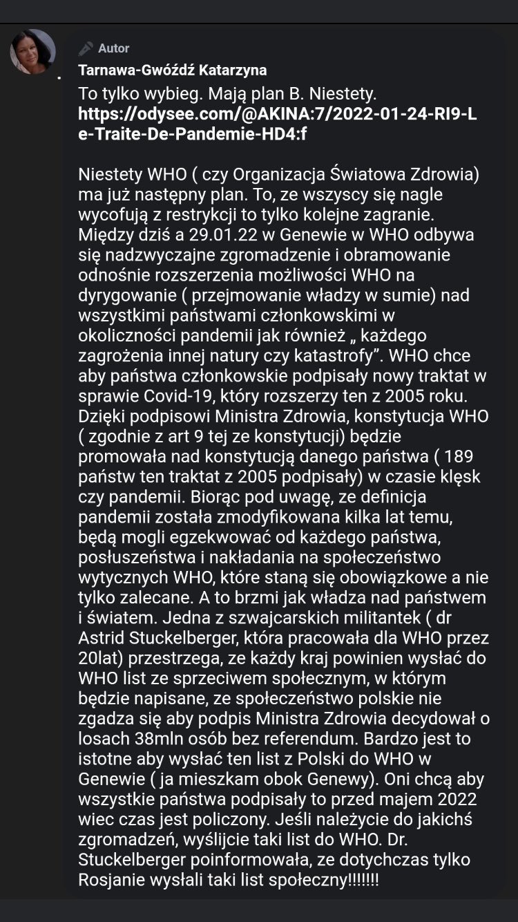 Czekam na jedno głosowanie i jak "nasi" "rządzący" będą głosowali za to bez wojny oddadzą władze onz. W sytuacji takiej jak była z tą pandemia władza będzie w rękach onz i krajowe przywództwo nic nie będzie miało do powiedzenia.