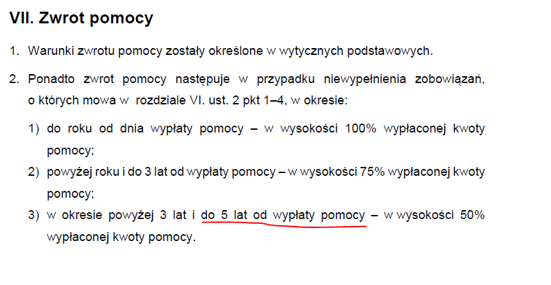 Na 100% 5 lat, jest w regulaminach gdzieś dokładna rozpiska. Nie pamiętam dokładnie ale jak w pierwszym roku zejdziesz z UR poniżej 85% to oddajesz 100% pomocy, później to maleje i wiem że jak np. w piątym roku nie utrzymasz UR 85% to kara 50% pomocy