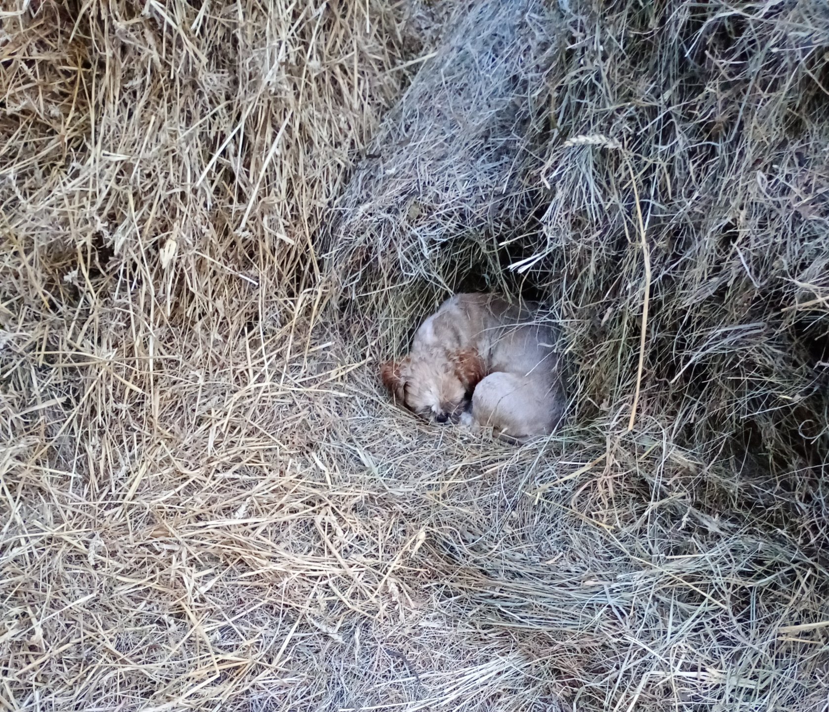 Skoro mowa o psach, to przedstawiam DJ-a...jakiś podły czlowiek nie miał co z nim zrobić i porzucił. Musiał się dość długo błąkać, bo potrzebne były nożyce do strzyżenia owiec, żeby go dziewczyny mogły doprowadzić do jakiegoś przyzwoitego stanu. On też lubi się wylegiwać w dłonie i sianie