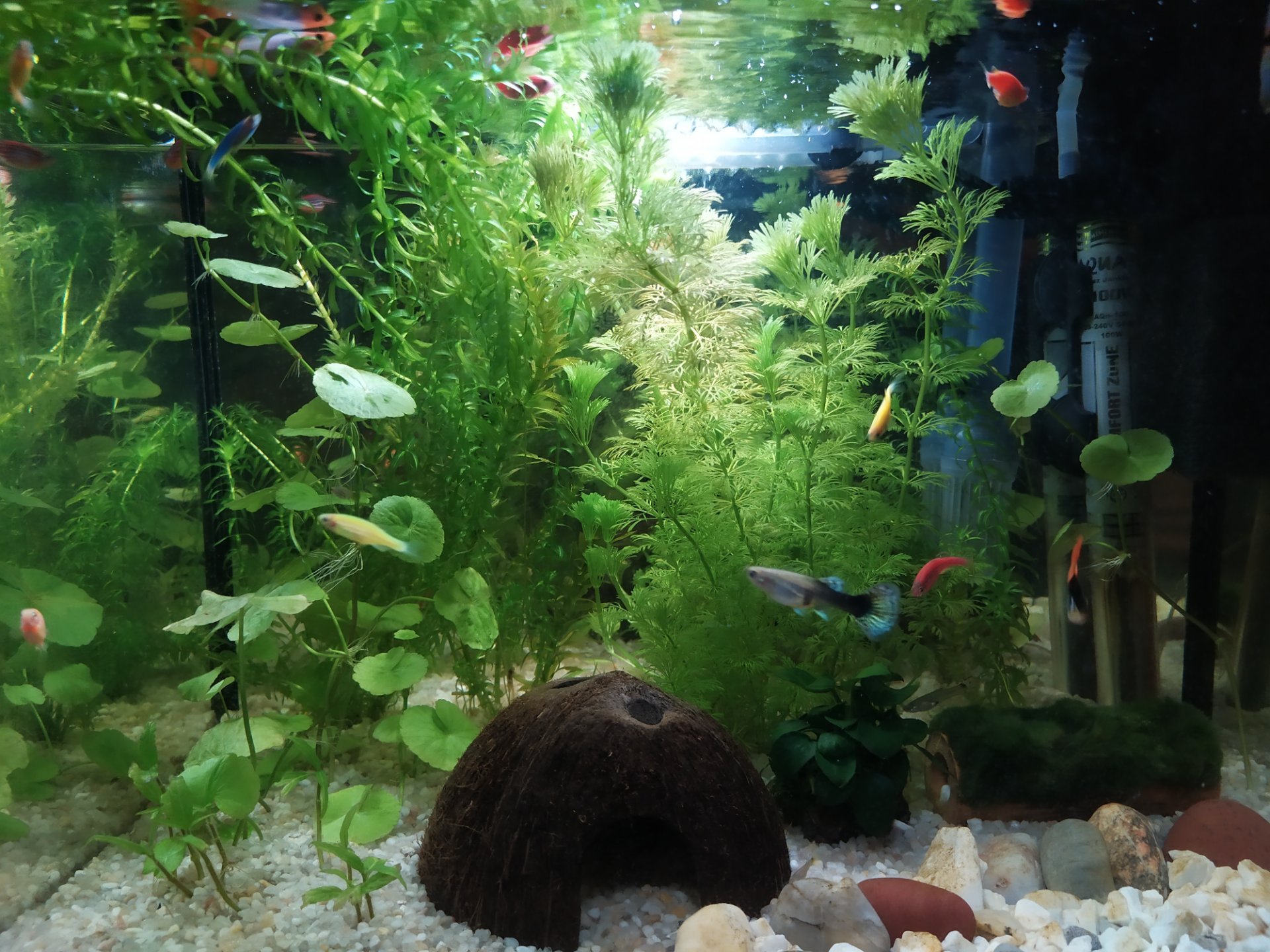 Gupiki są i Danio fluo i krewetka, glonojada nie mam, za małe akwarium, na jesień będę zakładał duże, to wtedy będzie. Może się trochę namnoży ich to będzie do dużego, już mam 6 rybek małych które się u mnie urodziły. 😁
