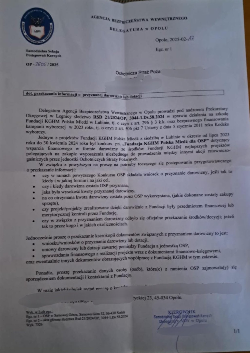 Przecież pisze że prowadzą śledztwo pod nadzorem prokuratury. Chcą informacji i to zdaje się nie pod kątem nękania OSP a podejrzenia wyrządzenia SSP szkody finansowej dużych rozmiarów. A czy komuś postawią zarzuty, to czas pokaże.