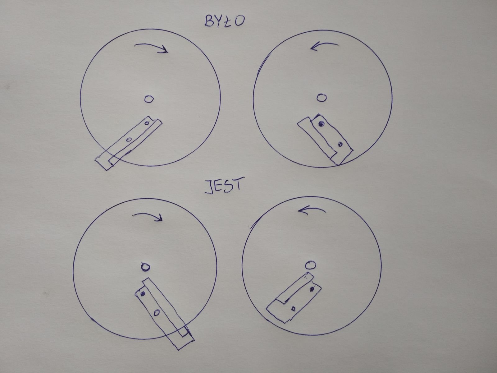 Kąt łopatek i ich usytuowanie na talerzu przez zamianę talerzy. Otwory do mocowania łopatek są tak zrobione, że lewy talerz to lewy i nie inaczej. Nie dało się tak po prostu ustawić łopatek, aby gdzieś coś nie wadziło i było jak należy. Na upartego można byłoby oczywiście poprzewiercać, ale bez wyjmowania talerzy było to awykonalne.